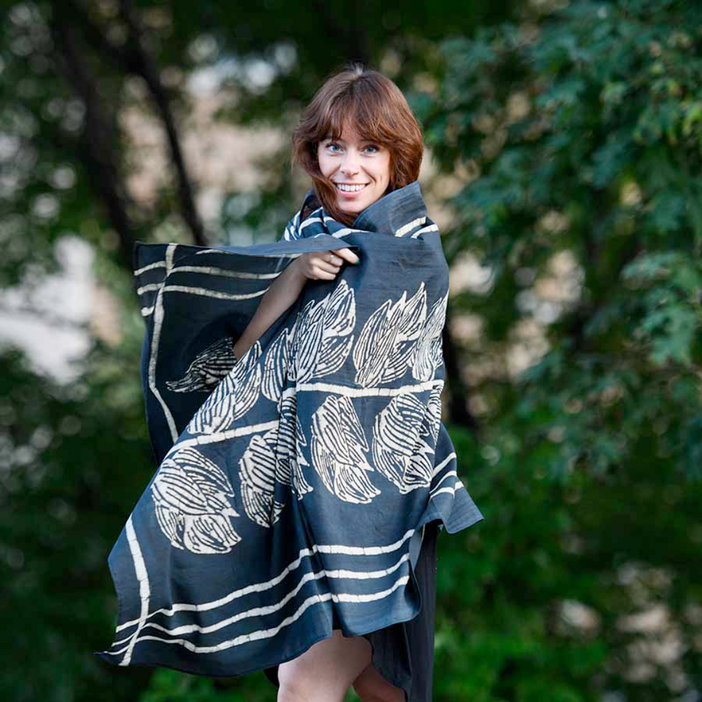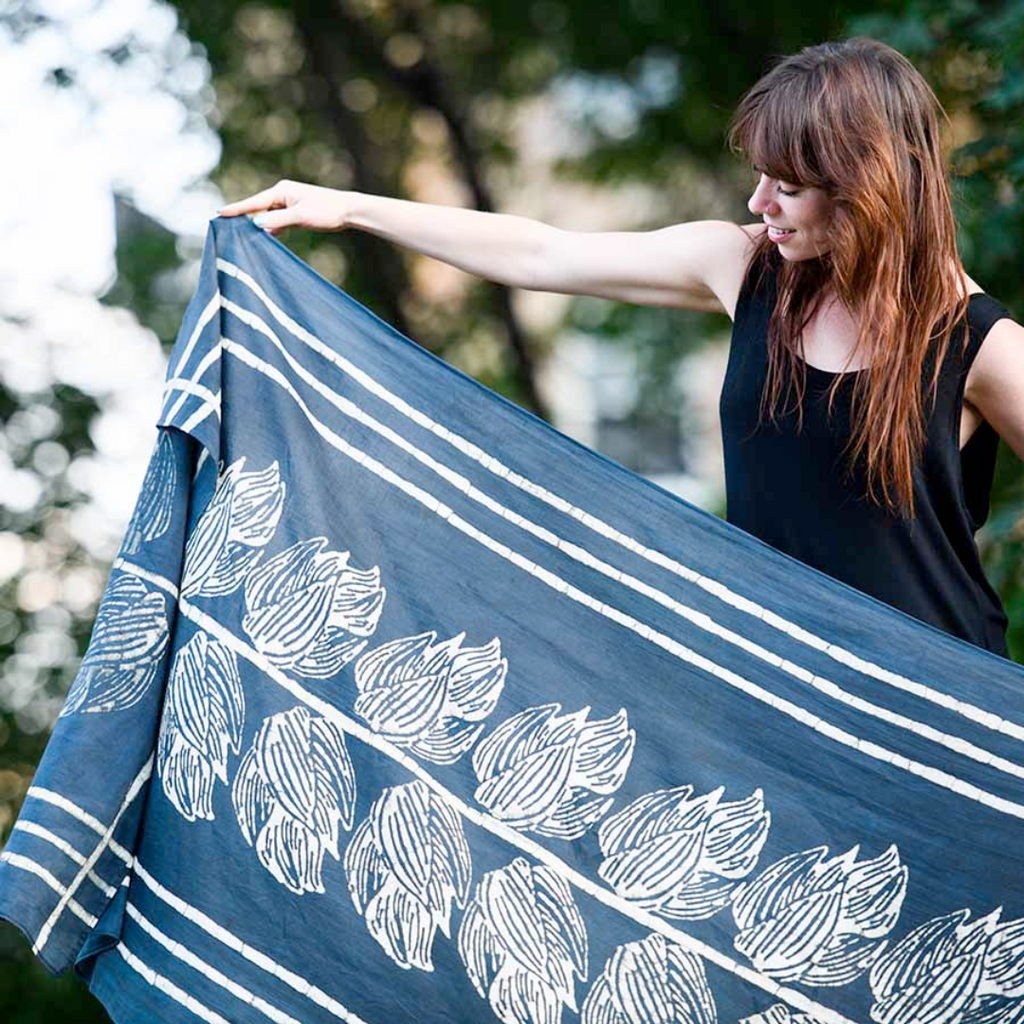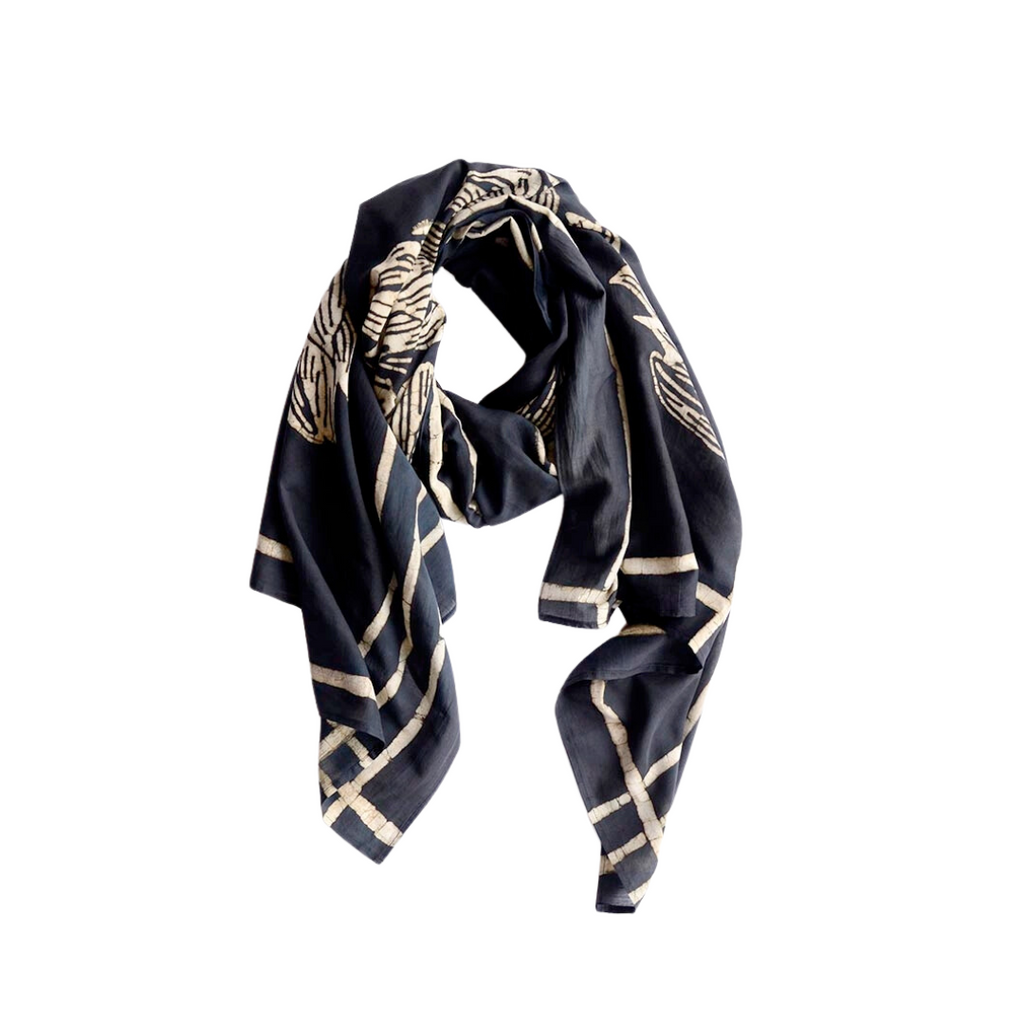Inspired by large tropical leaves found in the deserts of India, this black and white scarf by Ichcha is dyed naturally and hand block printed using carved wooden blocks and an iron and mud resist techniques. Made of 25% silk and 75% cotton, the scarf is soft to the touch and great for everyday wear and on special occasions! Measures 34" x 78". Sizes may vary 1-2 inches and there will be some color variance due to the handmade nature of the piece. CARE: hand or machine wash on cold gentle cycle. Lay flat to dry. Iron if necessary.