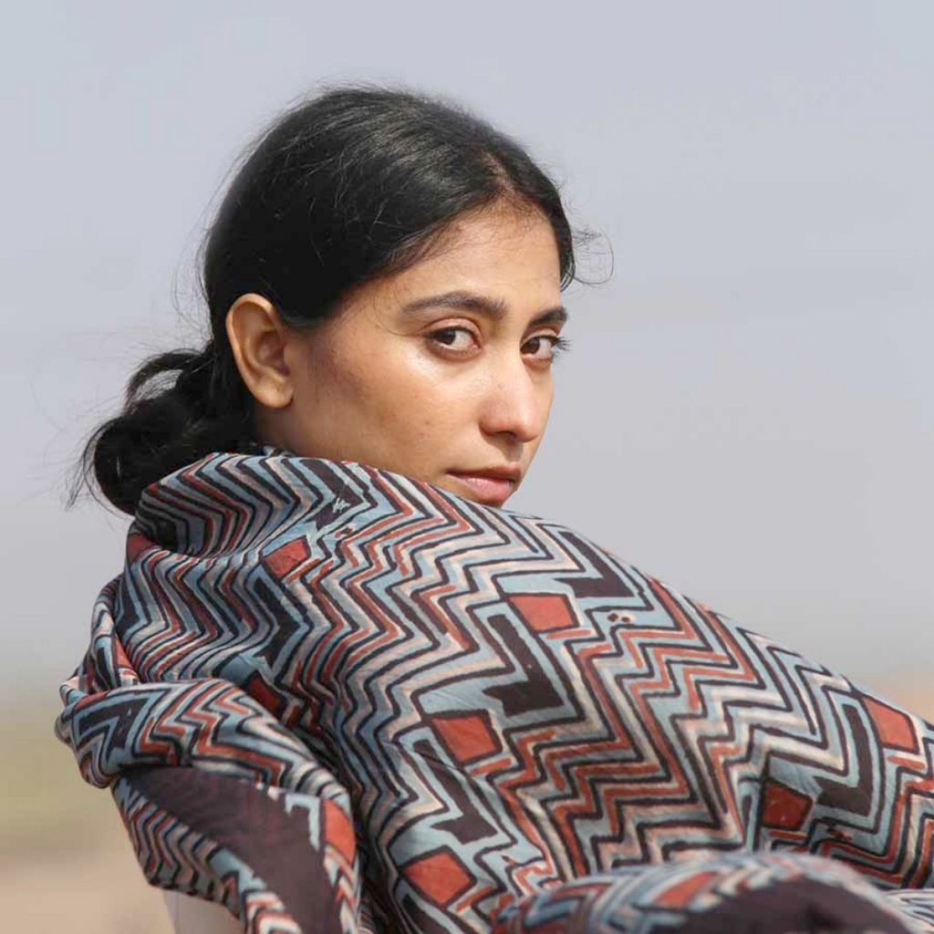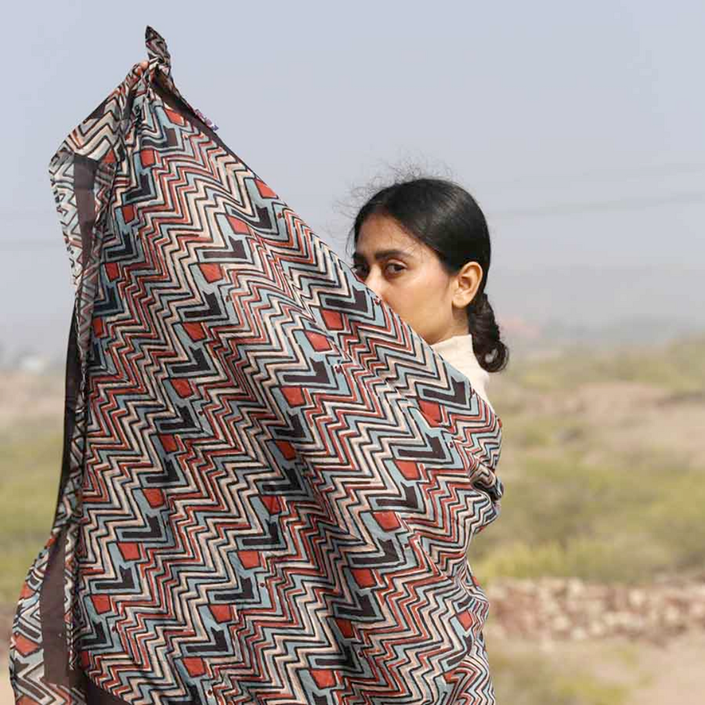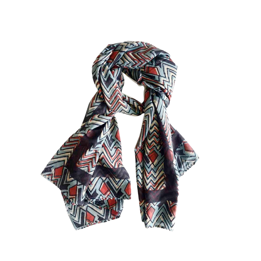 This fun, bold red, black, and blue scarf by Ichcha is dyed naturally and hand block printed using carved wooden blocks and an iron and mud resist techniques. Made of 25% silk and 75% cotton, the scarf is soft to the touch and great for everyday wear and on special occasions! Measures 34" x 78". Sizes may vary 1-2 inches and there will be some color variance due to the handmade nature of the piece. CARE: hand or machine wash on cold gentle cycle. Lay flat to dry. Iron if necessary.