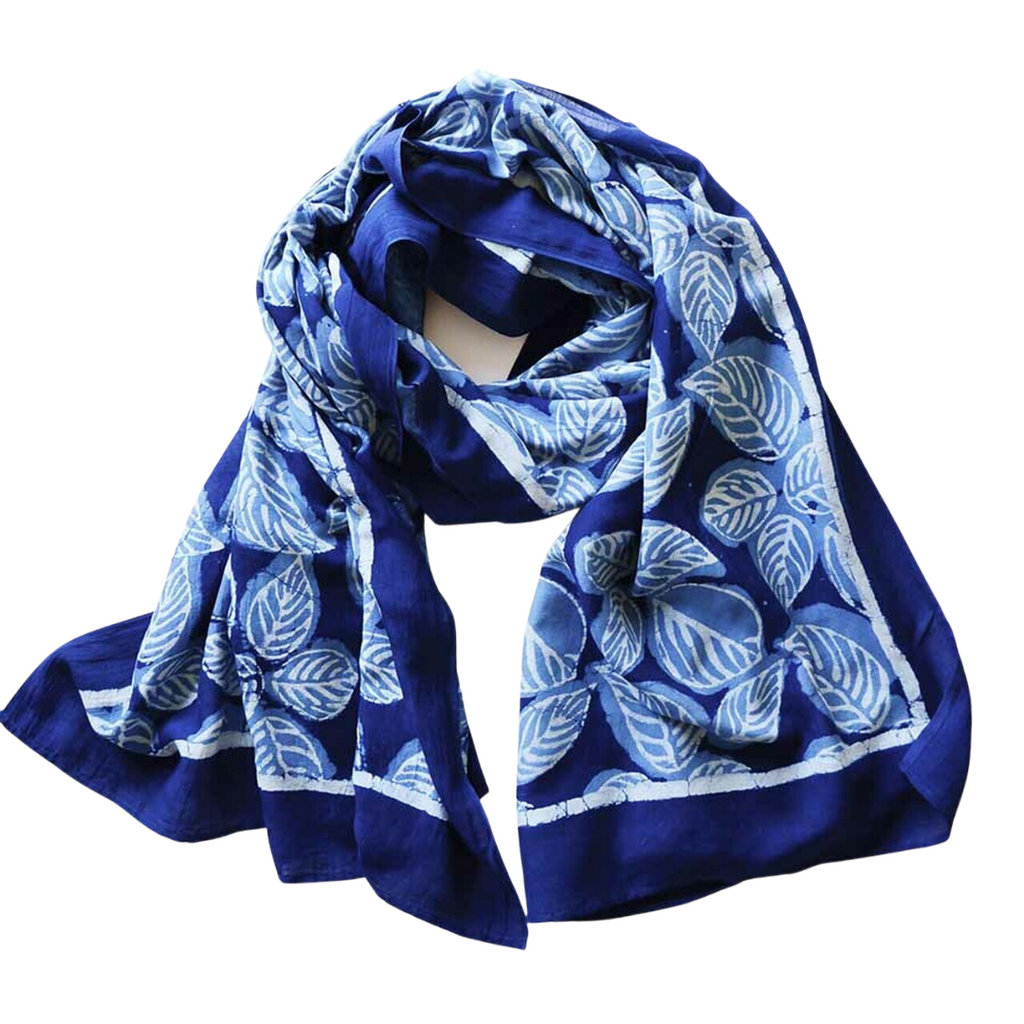 This beautiful blue leaf-patterned scarf by Ichcha is dyed naturally and hand block printed using carved wooden blocks. Made of 25% silk and 75% cotton, the Moni scarf is soft to the touch and great for everyday wear and on special occasions! Measures 36" x 78". Sizes may vary 1-2 inches and there will be some color variance due to the handmade nature of the piece.