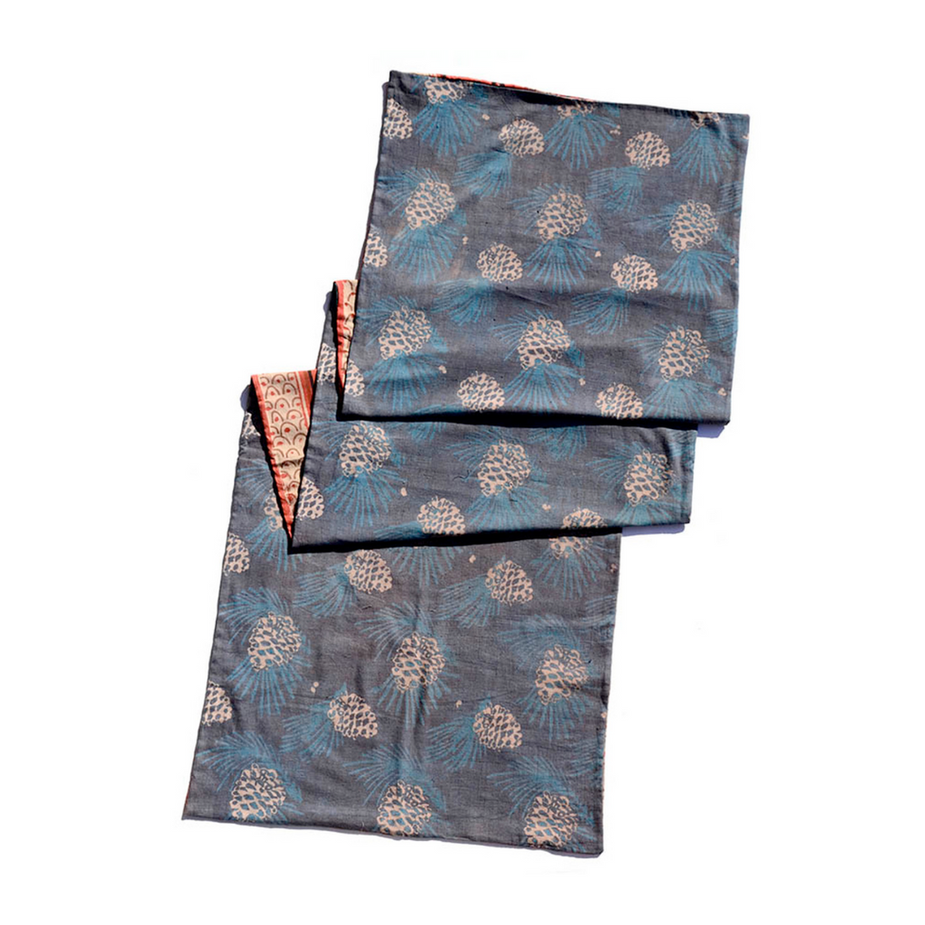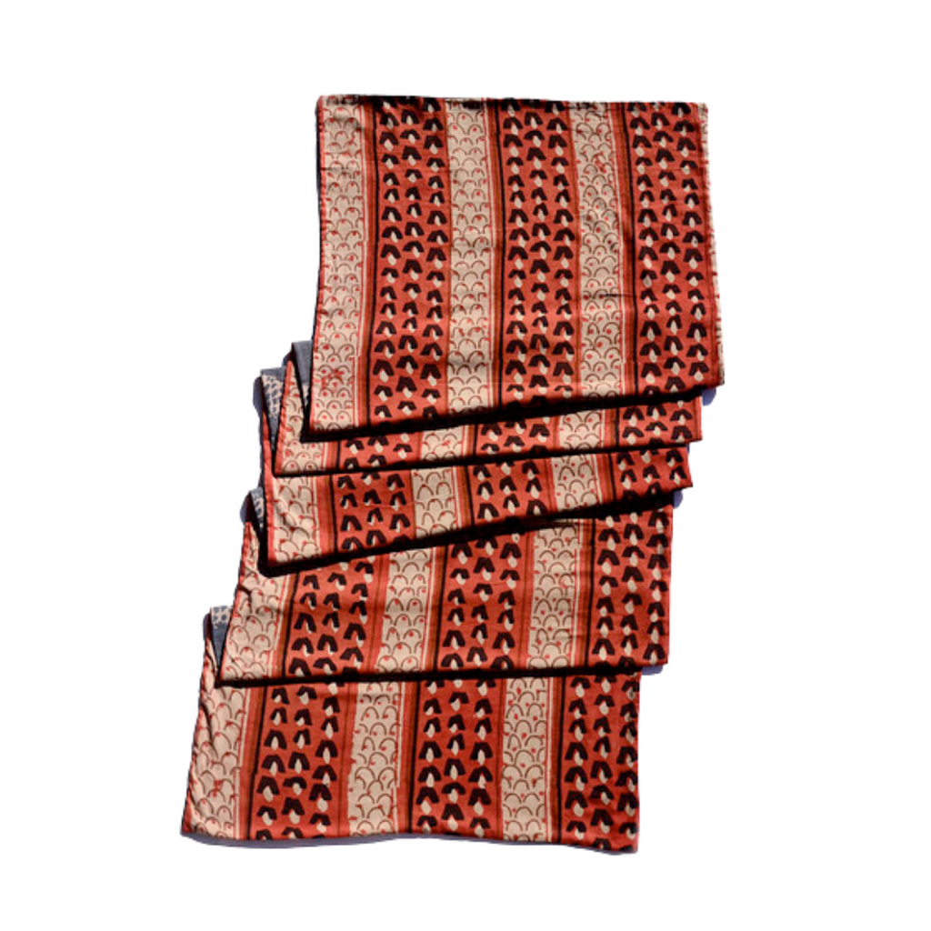 Hand block printed using carved wooden blocks in rich colors of red and purple, the reversible Naomi scarf is great for everyday wear and on special occasions! This scarf is made with two pieces of fabric. A handwoven organic cotton and a lightweight machine woven cotton are put together and then block printed with natural dyes. Measures 22" x 78" with medium weight for keeping you both warm and chic. Sizes may vary 1-2 inches and there will be some color variance due to the handmade nature of the piece.
