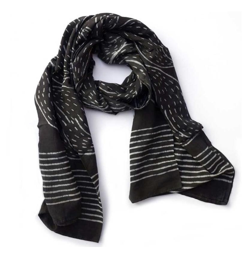 This beautiful black and white scarf by Ichcha is dyed naturally and hand block printed using carved wooden blocks. Made of 25% silk and 75% cotton, the Nimboo scarf is soft to the touch and great for everyday wear and on special occasions! Measures 36" x 78". Sizes may vary 1-2 inches and there will be some color variance due to the handmade nature of the piece.