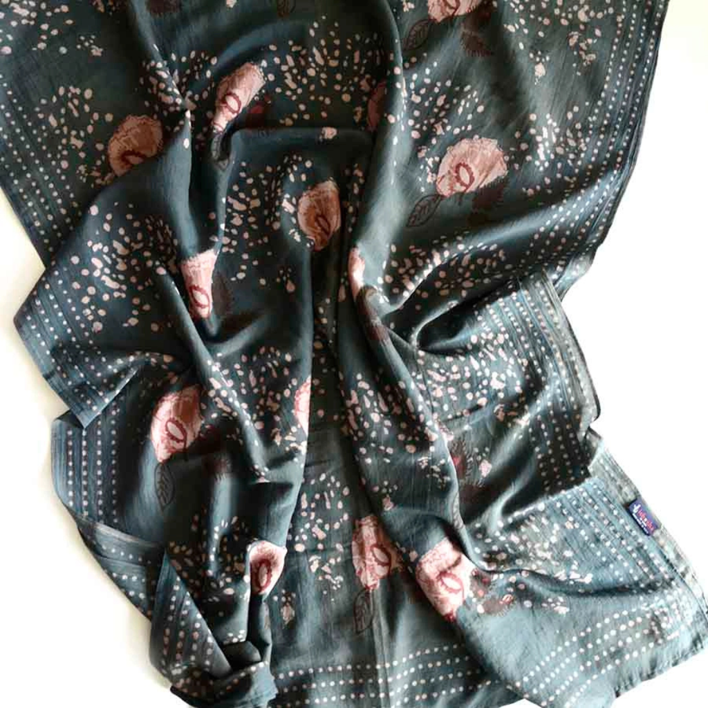 Adorned with blush pink florals and soft speckled details, this forest green scarf by Ichcha is dyed naturally and hand block printed using carved wooden blocks and an iron and mud resist techniques. Made of 25% silk and 75% cotton, the Komal scarf is soft to the touch and great for everyday wear and on special occasions! Measures 34" x 78". Sizes may vary 1-2 inches and there will be some color variance due to the handmade nature of the piece. CARE: hand or machine wash on cold gentle cycle. Lay flat to dry. Iron if necessary.