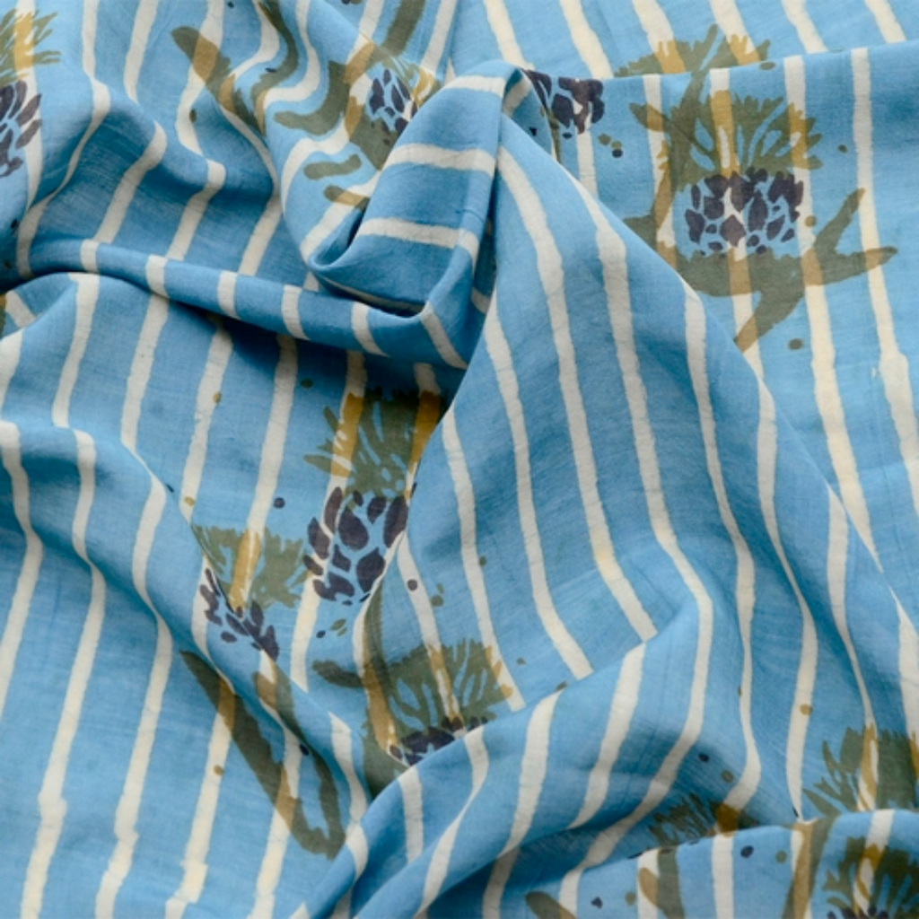 A fun mix of floral and stripes, this sea foam and ivory bandana by Ichcha is dyed naturally and hand block printed using carved wooden blocks. Made of 25% silk and 75% cotton, the Romagna bandana is soft to the touch and great for everyday wear and on special occasions! Wear as a neckerchief, head band, or a hair tie. Measures approximately 22" square. Sizes may vary slightly and there will be some color variance due to the handmade nature of the piece.