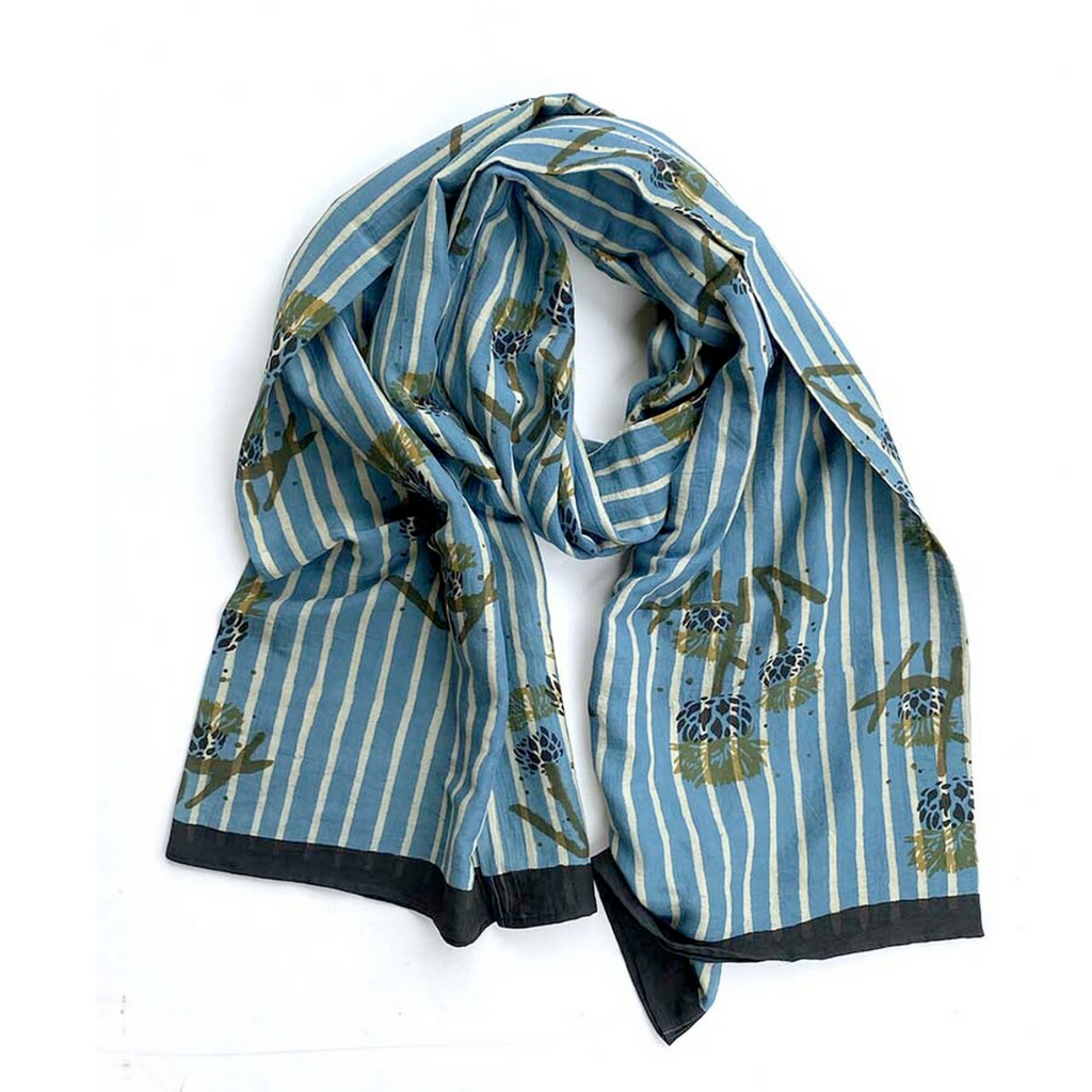 A fun mix of floral and stripes, this sea foam and ivory scarf by Ichcha is dyed naturally and hand block printed using carved wooden blocks. Made of 25% silk and 75% cotton, the Romagna scarf is soft to the touch and great for everyday wear and on special occasions! Measures 36" x 78". Sizes may vary 1-2 inches and there will be some color variance due to the handmade nature of the piece.
