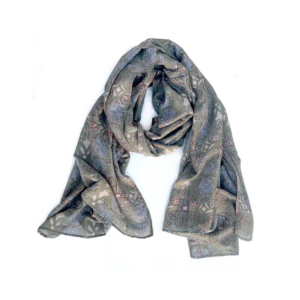 This beautiful green, blue and ivory floral scarf by Ichcha is dyed naturally and hand block printed using carved wooden blocks. Made of 25% silk and 75% cotton, the Badra scarf is soft to the touch and great for everyday wear and on special occasions! Measures 34" x 78". Sizes may vary 1-2 inches and there will be some color variance due to the handmade nature of the piece.