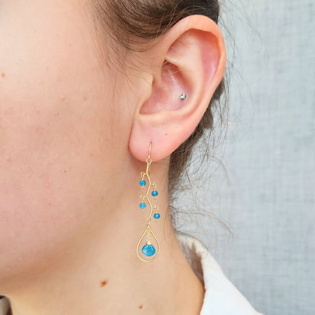 Elegant handcrafted wire wrapping meets colorful gemstones in Lina Tsui jewelry. These earrings are made of 14k yellow gold fill wire, apatite briolettes, and gold filled ear wires, and measure 2" long x 0.44" wide. Handcrafted in US.