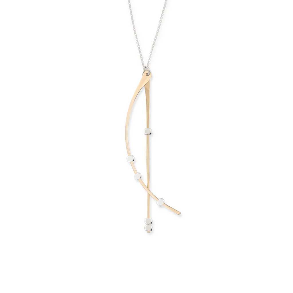 Inspired by the starry night sky, this mixed metal Astral necklace by Freshie & Zero has a nice celestial vibe. Made of sterling silver and gold fill, this minimalist, yet subtly dramatic necklace is lightweight and sculptural with a nice movement to it. Pendant measures approximately 2.5" long with a 16" sterling silver chain. Handmade in US.