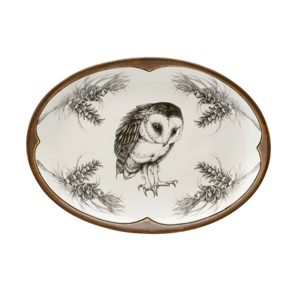 Welcome the charm and serenity that is nature into your home with a beautiful Laura Zindel piece! Both functional and decorative, this small oval platter with brown accent color adorns the artist's original illustration of a barn owl. Made from earthenware and glazed with non-toxic, low-fire glazes. Measures 14" x 10" x 1.5". Handcrafted in US Hand wash only in warm soapy water with a non-abrasive cloth; they should not be placed in the oven, microwave, or dishwasher and should be used only as serving dishes. Avoid storing for long periods of time in direct sunlight.