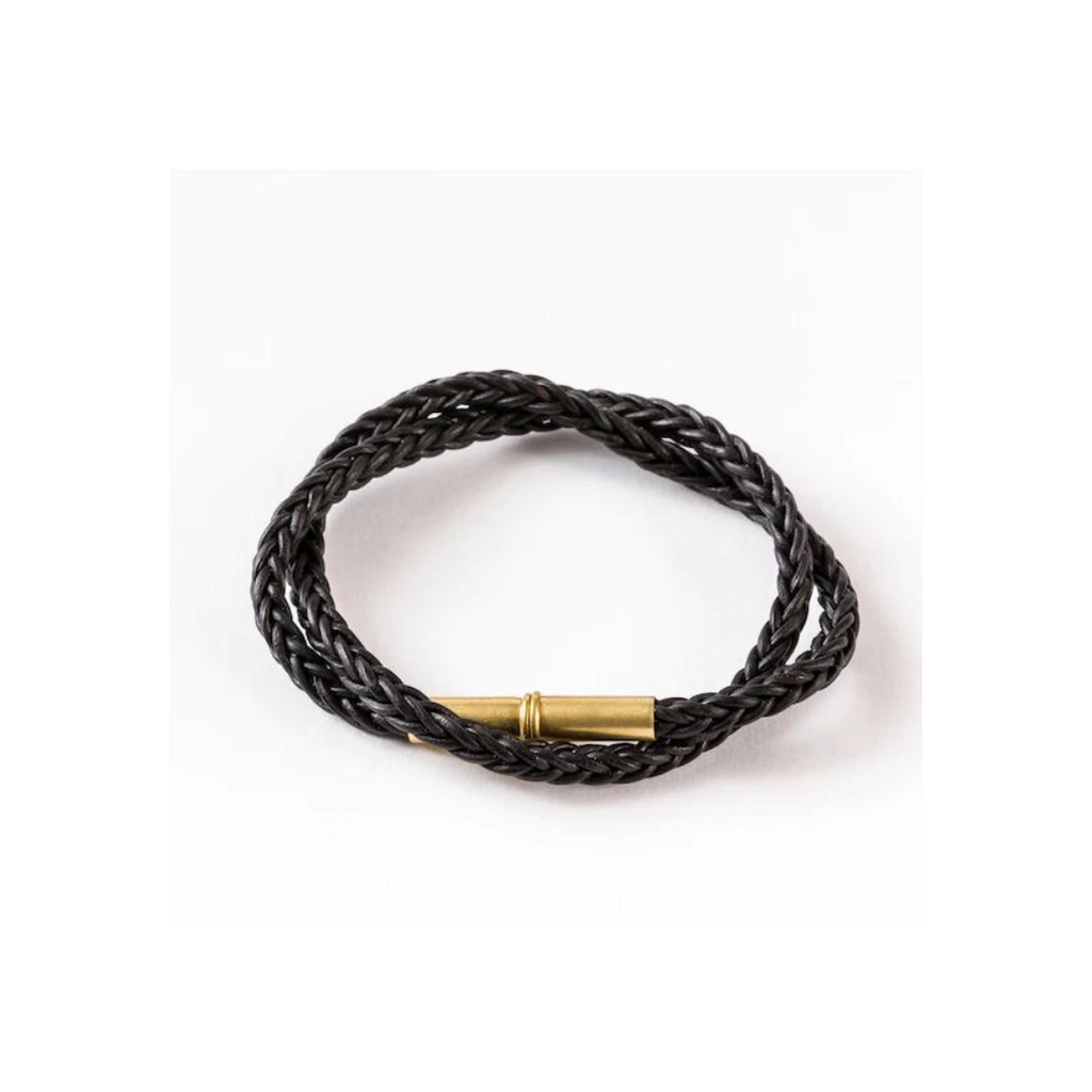 This Flint bracelet by Aaron Boyd of Tres Cuervos gives a rustic and rugged look to any outfit. Made with black leather, and the magnetic closure is made with reconditioned .22 shells. Measures approximately 15.75" long, and is meant to wrap around the wrist twice. Limit contact with water. Leather and brass naturally darken over time, and add to the authentic, rustic look. Handcrafted in US.