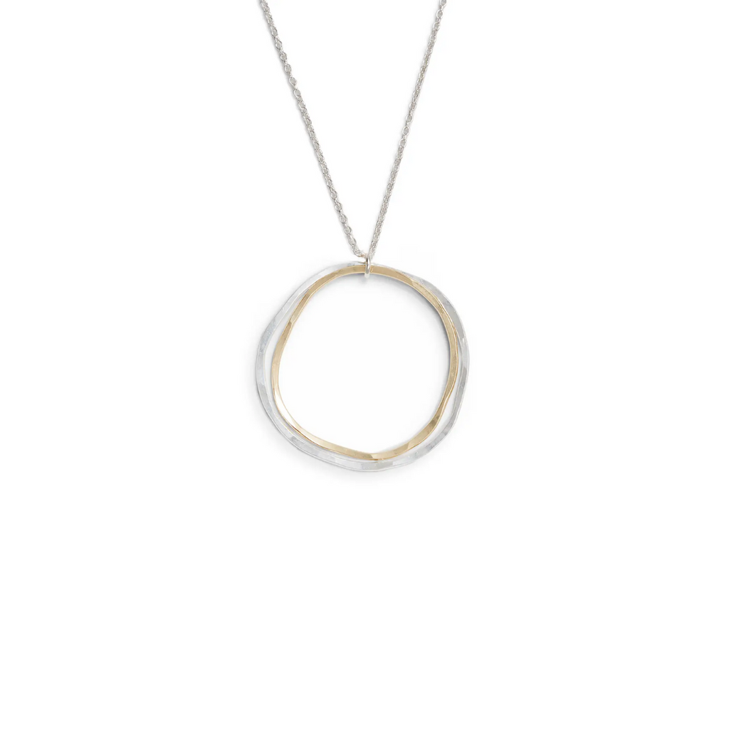 Minimalism at its best, this Caldera necklace by Freshie & Zero is light, sexy, and great for everyday wear! Two organically shaped circles in sterling silver and gold fill are held together and suspended on a 16" sterling silver chain. The pendant measures 1.25" in diameter. Handmade in US.