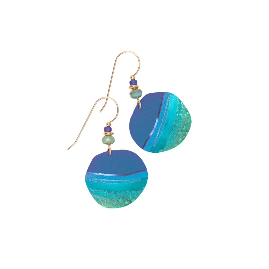 Add a pop of color and nature-inspired design with these earrings by Holly Yashi. Made of niobium with gold-filled earwires, these earrings evoke the scene of the ocean with sandy shores in aquatic colors of blue and green with matching glass bead elements. Measure 1.75" L x 1" W. Handcrafted in US.