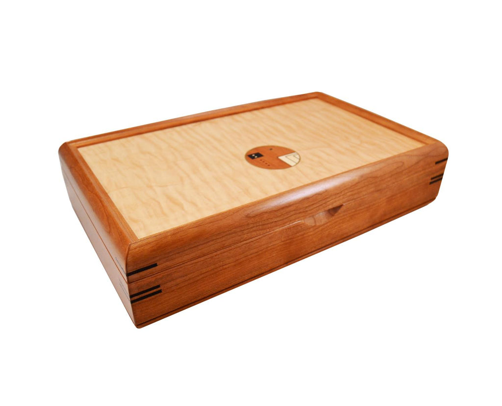 A stunning design paired with precise craftsmanship, this wooden box gives you an elegant yet functional way to store and organize your jewelry. Equipped with multiple compartments and plush ring inserts, this box has a place for all your valuables and space for your rings, necklaces, earrings, and bracelets. Made of cherry, holly, curly maple, paduak, black obeechie, and wenge wood. Measures 13L x 8W x 3H inches. Handcrafted in the US.