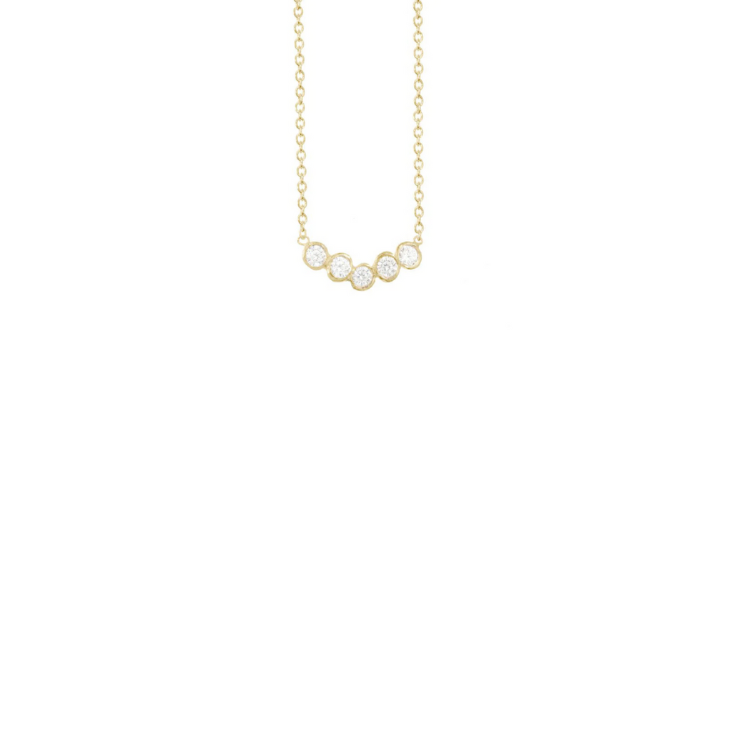 Elegant design meets the innate beauty of nature in Catherine Weitzman jewelry! Cast from real seed pods, this necklace features five sparkly round crystals clustered together in a chevron shape with textured detailing in the metal that mirror the natural world. Made of 18k yellow gold vermeil, the chevron measures 0.5" across and the vermeil chain is 18". Handcrafted in Honolulu, Hawaii.
