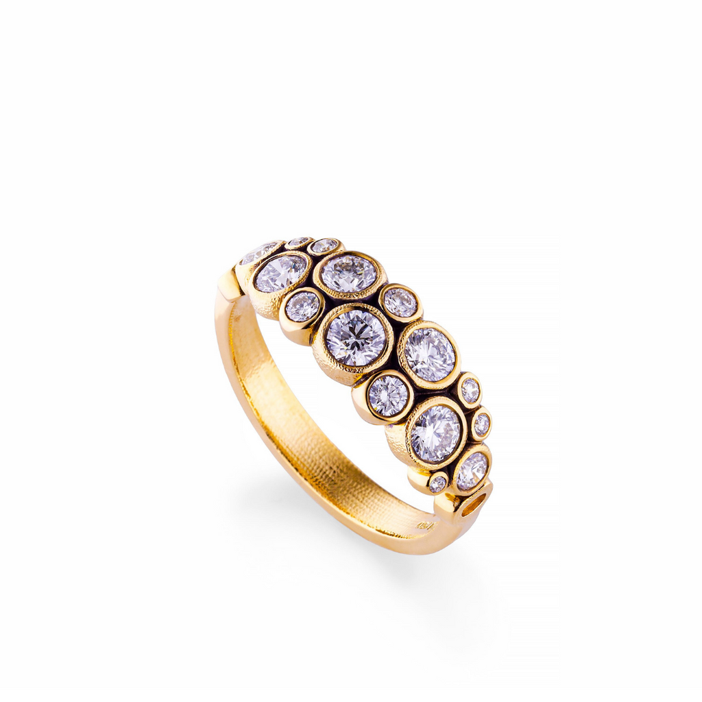 Enjoy the unique world that is Alex Sepkus! Treasure the designer's exquisite, museum-quality jewelry with his distinctive design elements and textures. This 18k yellow gold Diamond Ring (R-113D) has fifteen round brilliant cut diamonds with a total weight of 0.95 carats (F-G color, VVS clarity). The ring size is 7. Can be resized or special ordered in a different size ~ please contact us for details. Handcrafted in US.