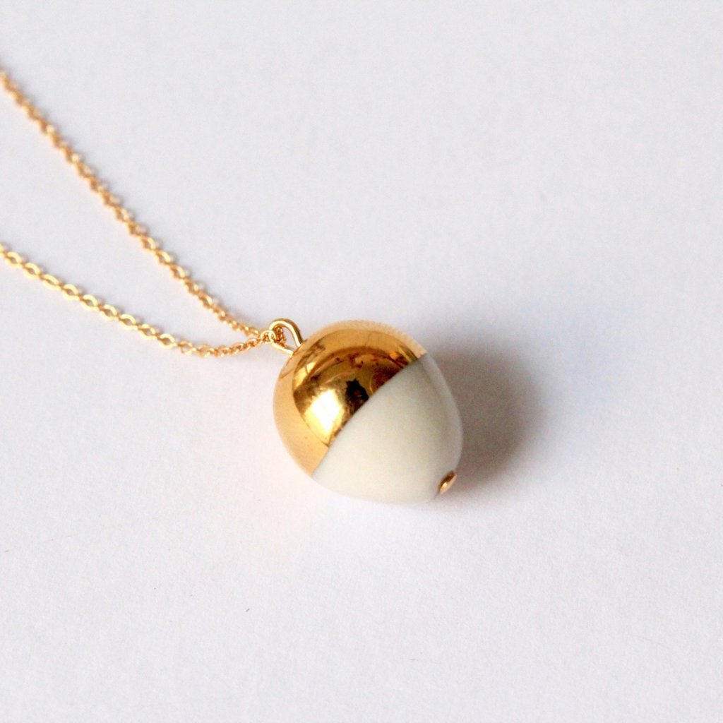 Inspired by nature, the ocean, organic shapes, and textures, Mier Luo jewelry will bring a classic and unique twist to your personal collection! Each piece is made from porcelain and 22k gold glaze. The Gold Dipped Acorn Necklace has a 19.5" gold filled chain and the pendant measures approximatly 0.63" long. Please note there might be slight variations in the color and size since each piece is handmade, sculpted, and assembled by Mier herself in her studio in New York City.