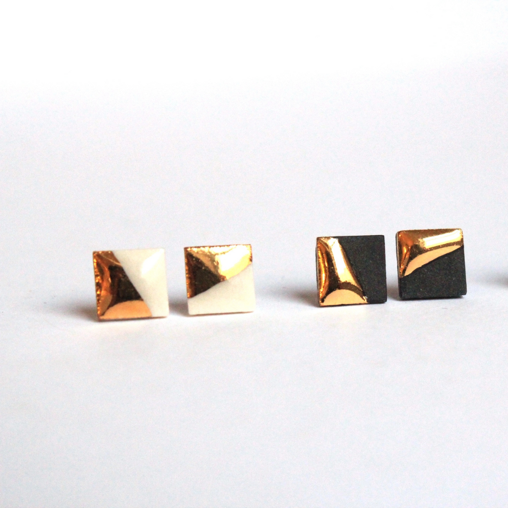 Inspired by nature, the ocean, organic shapes, and textures, Mier Luo jewelry will bring a classic and unique twist to your personal collection! Each piece is made from porcelain and 22k gold glaze. The Gold Dipped Square Stud Earrings have gold filled posts and measure approximatly 0.25" by 0.25". Please note there might be slight variations in the color and size since each piece is handmade, sculpted, and assembled by Mier herself in her studio in New York City.