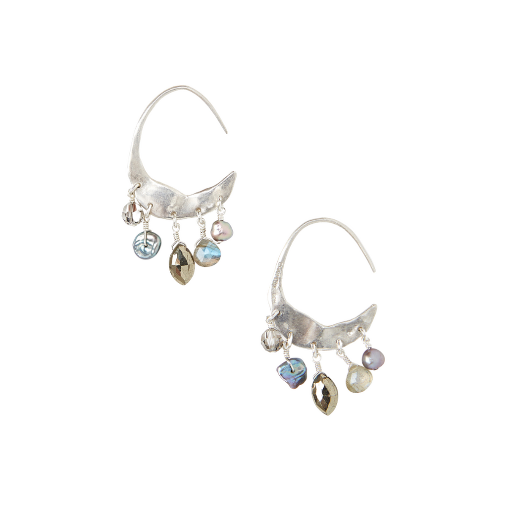 Elegant and festive, these multi stonel earrings are a nice modern take on your classic hoops. These Chan Luu earrings feature a cascade of freshwater pearls, Labradorite, Pyrite, and Satin Crystal beads that are suspended from a crescent moon silhouette. Made of sterling silver, the earrings measure 1.4" long and 0.75" wide. Handmade in Vietnam.