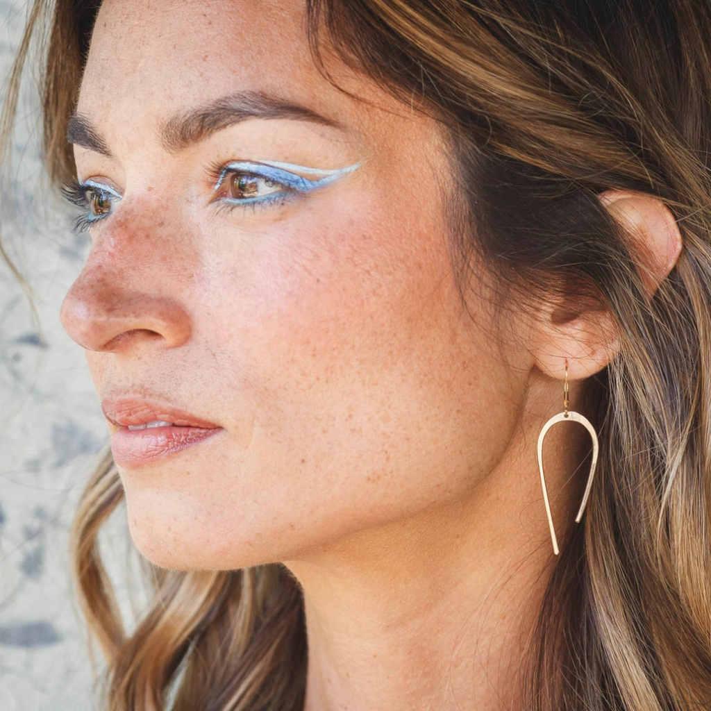 Minimalism at its best, these hammered arch swooping line earrings by Freshie & Zero are light, sexy, and great for everyday wear! The hammered sterling silver is curved in a pleasing swooping line and is suspended on sterling silver lever back ear wires. These earrings measure approximately 0.75" wide and 2" from the top of the ear wire to the bottom of the circle. Handmade in US.