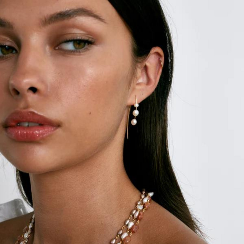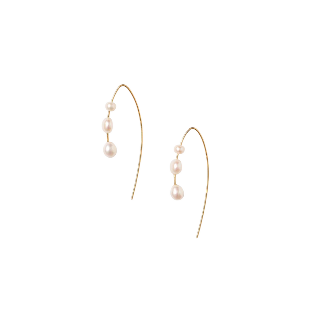 Elegant and delicate, these earrings are a nice modern take on your classic pearl jewelry. These Chan Luu earrings feature graduated white freshwater pearls fixed on long earwires. Made of 18k yellow gold plate over sterling silver, the earrings measure 1.75" long. Handmade in Vietnam.