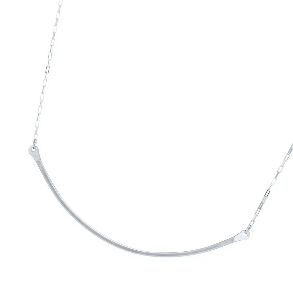 This Horizon curved bar necklace by Freshie & Zero is light, sexy, and great for everyday wear! Made of sterling silver, this minimalist, yet subtly dramatic necklace is lightweight and sculptural. The curved bar measures approximately 3.25" across and is suspended on a 16"-18" sterling silver chain. Handmade in US.