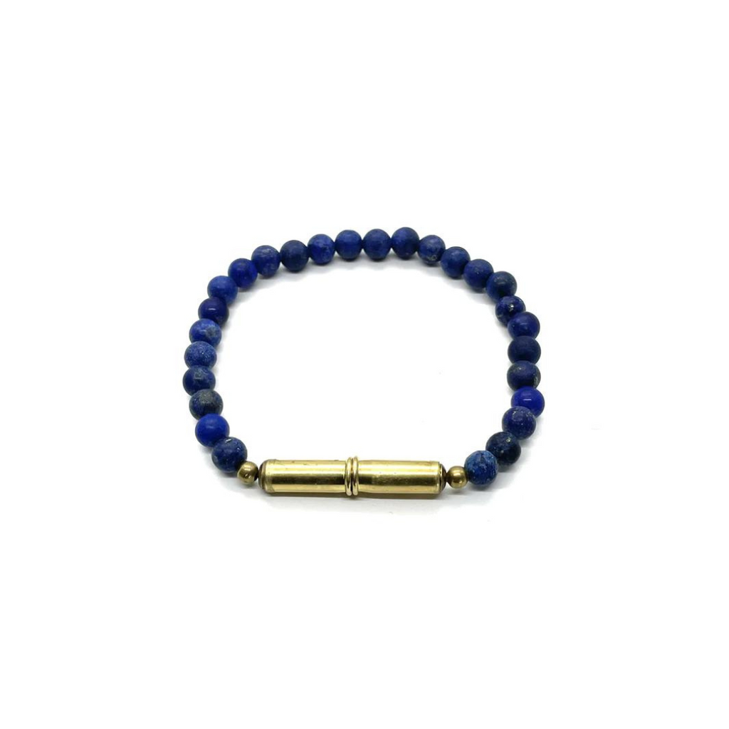 This Flint bracelet by Aaron Boyd of Tres Cuervos gives a rustic and rugged look to any outfit. Made with Lapis beads, and the magnetic closure is made with reconditioned .22 shells. Measures approximately 7.25". Limit contact with water. Brass naturally darkens over time, and adds to the authentic, rustic look. Handcrafted in US.
