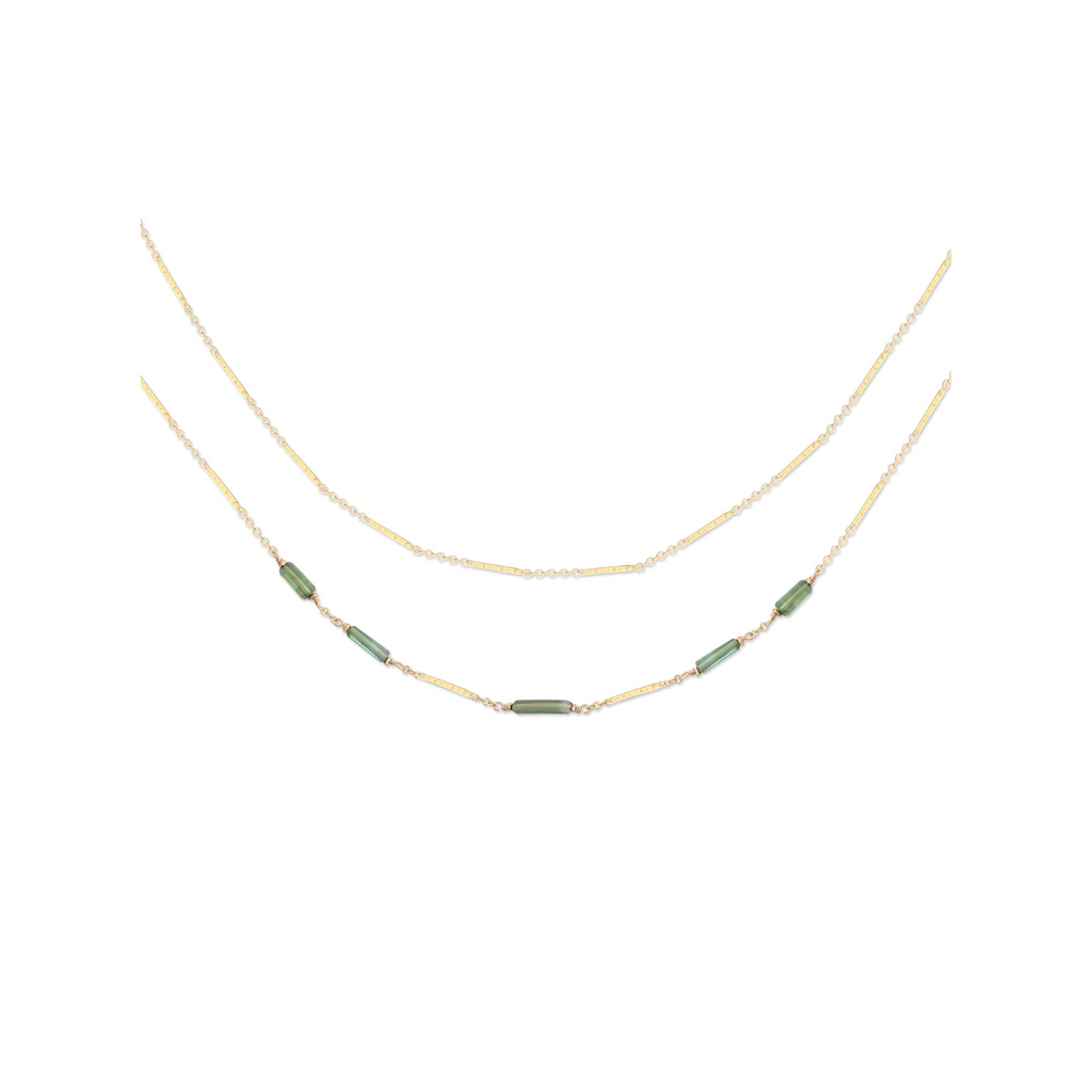 Defined by modern elegance, Kate Winternitz creates delicate, thoughtful jewelry to showcase her love of detail and composition. The Linda Necklace features two strands, the shorter with delicate gold horizontal stations and the longer with green tourmaline bead stations. Made from 14kt gold fill. The shorter strand is 16" and the longer strand is 18" with two extra inches to adjust. Handmade in US.