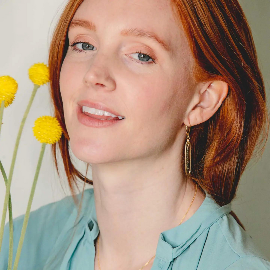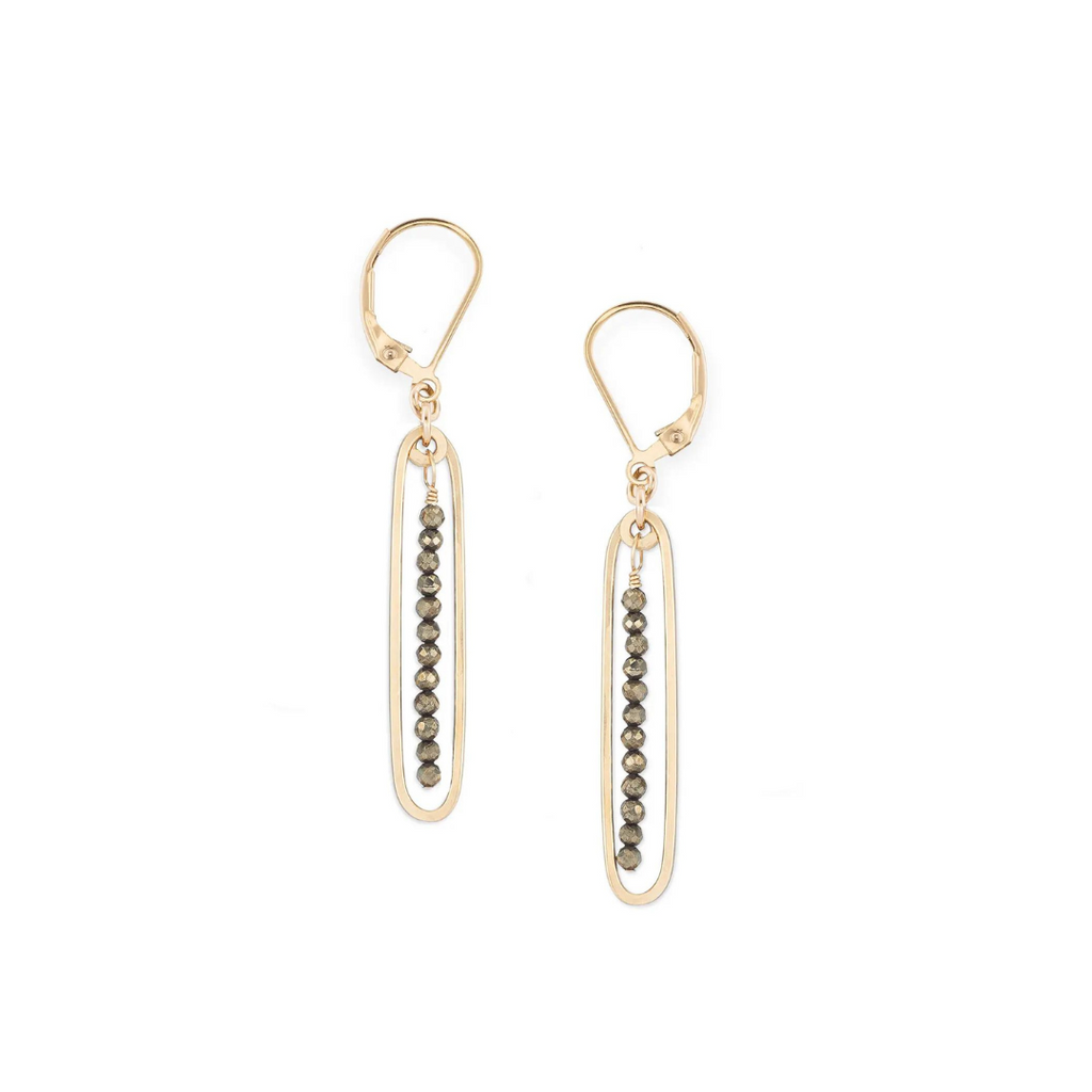 Minimalism at its best, these gold filled pyrite earrings by Freshie & Zero are light, sexy, and great for everyday wear! The earrings features a delicate row of faceted pyrite beads surrounded by a narrow frame of hammered gold filled wire that is suspended on leverbacks. They are 1.13" long from the top of the earwire to the bottom and 0.25" wide. Handmade in US.