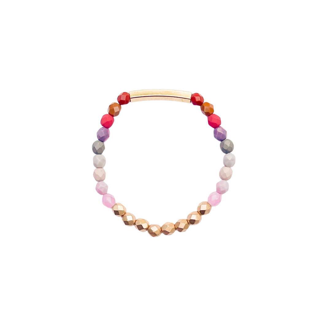 Add a pop of color and joy to your daily jewelry ensemble with this ombre bracelet by Nest Pretty Things. The stretch cord bracelet is made with 6mm czech glass beads and a 1.5" long brass bead. Measures 7". Handcrafted in US.