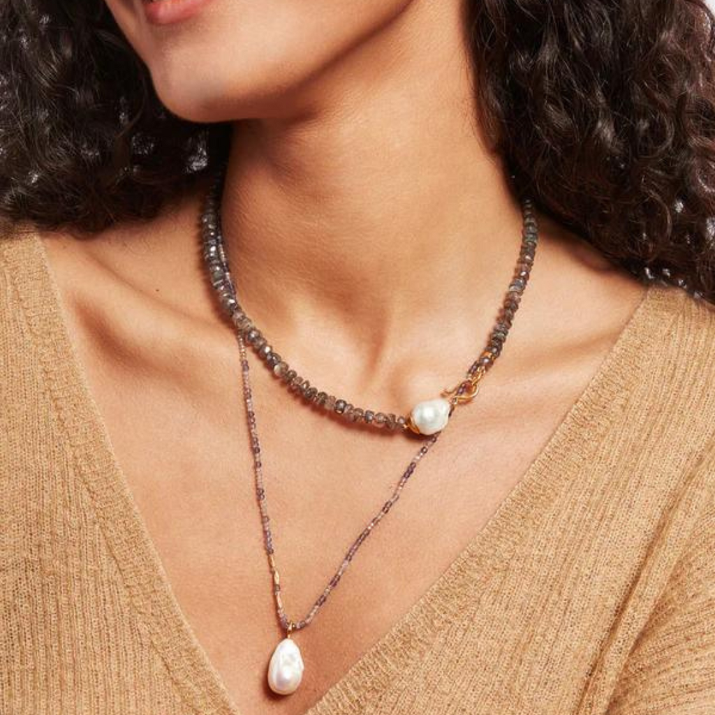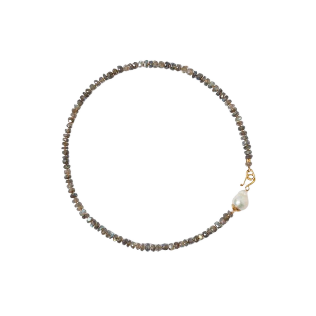 Eye catching and elegant, this neckalce is a nice modern take on your classic jewelry. This Chan Luu necklace is strung with mystic labradorite beads with a baroque pearl hook clasp that can be worn as an accent in the front. Made of 18k yellow gold plate over sterling silver, the necklace measures 17". Handmade in Vietnam.