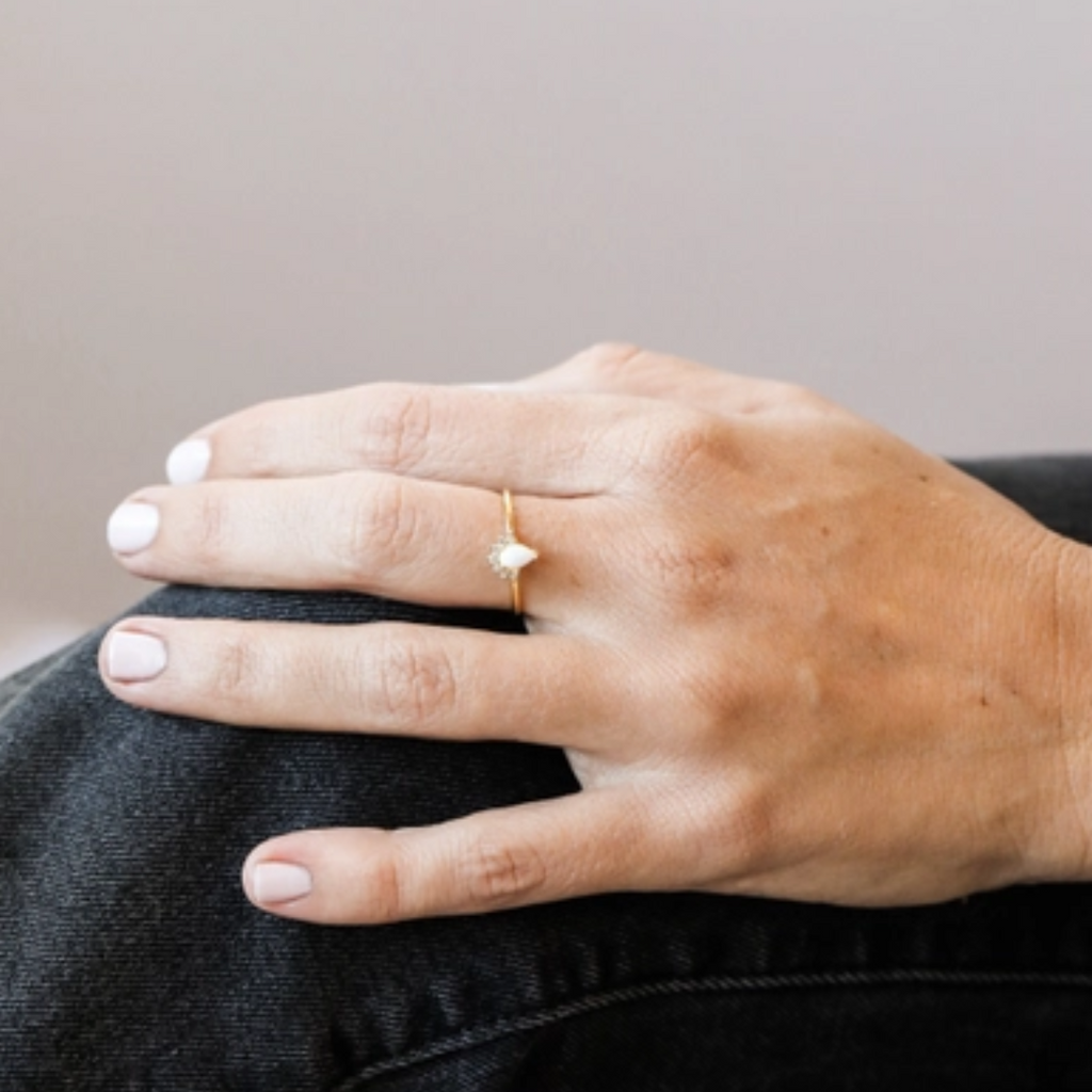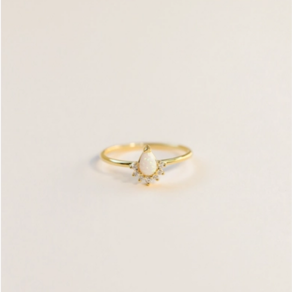 Elevate your style with this beautiful simulated opal ring by JaxKelly! This ring features a pear shape simulated white opal with 7 white cubic zirconias on a straight polished band. Made of 14ky gold vermeil over sterling silver. The ring measures 0.31" wide at the top with the stone and the band is 1.5mm wide. The ring is a size 8. This ring pairs beautifully with the artist's open pave band. Handmade in US.