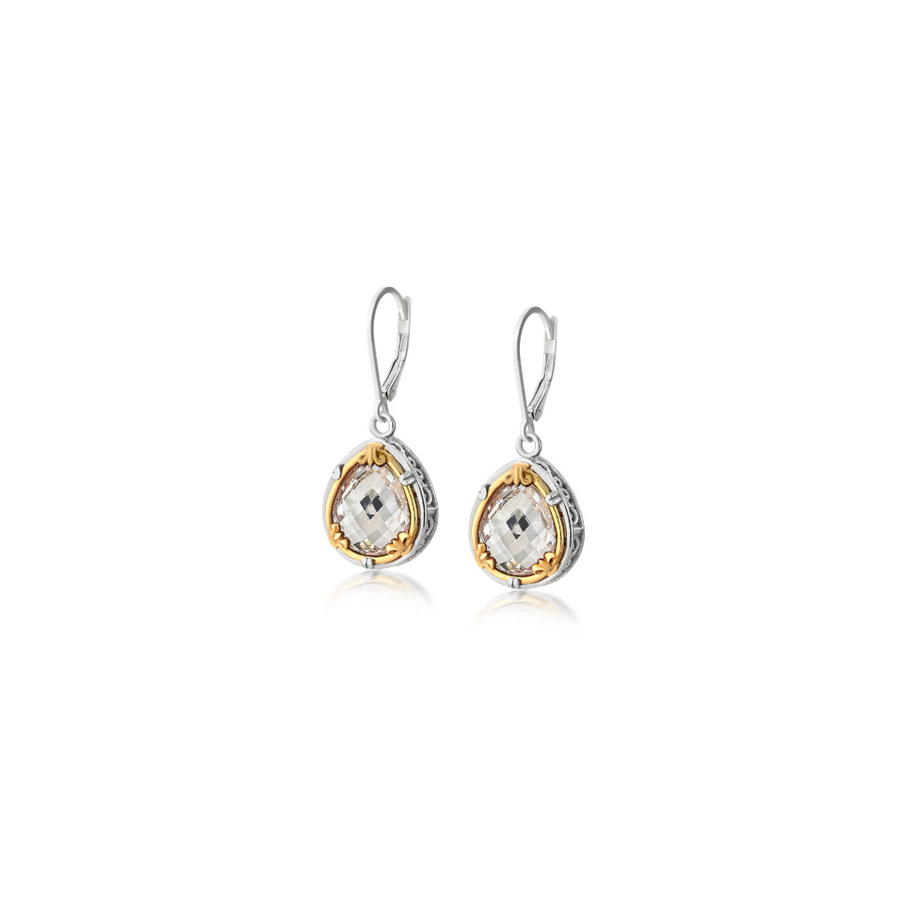 Inspired by European wrought ironwork, jewelry of ancient civilizations, and the interplay of handmade textures and metal weaves, these earrings by Anatoli is unique in design. Made of rhodium-plated sterling silver with vermeil accents, the earrings feature a faceted pear-shaped rock crystal with a beautifully detailed bezel. The earrings measure 1.25" long including the leverbacks and 0.5" at the widest . Handmade in US.