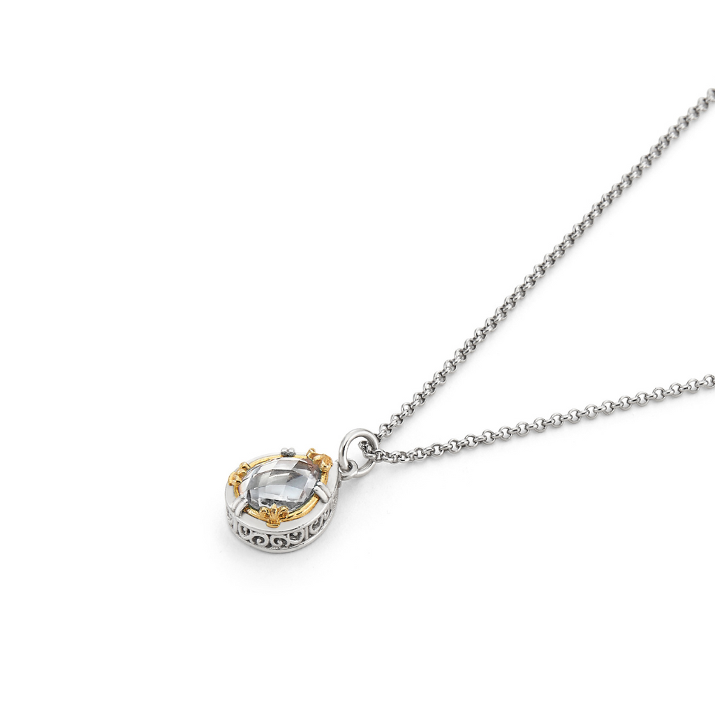Inspired by European wrought ironwork, jewelry of ancient civilizations, and the interplay of handmade textures and metal weaves, this necklace by Anatoli is unique in design. Made of rhodium-plated sterling silver with vermeil accents, the necklace features a faceted pear-shaped rock crystal surrounded by a beautifully detailed bezel. The pendant measures 0.88" tall including the bail and 0.5" at the widest. The sterling silver chain can be worn at 16" and 18". Handmade in US.