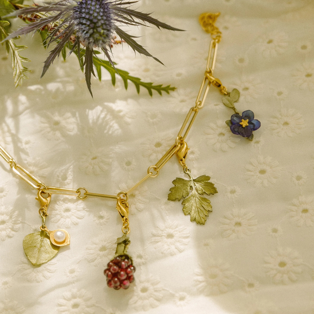 Behold nature and all its beauty with this Raspberry Charm by Silver Seasons. Made by creating molds directly from botanical elements, artist Michael Michaud effortlessly captures both the beauty and details of the actual flora. Made with cast bronze with a soft green patina and cast glass to make the raspberry. The charm is approximately 0.5" wide and 1.5" long with a gold filled lobster claw clasp to hang the charm on a bracelet or chain. Handmade in US.