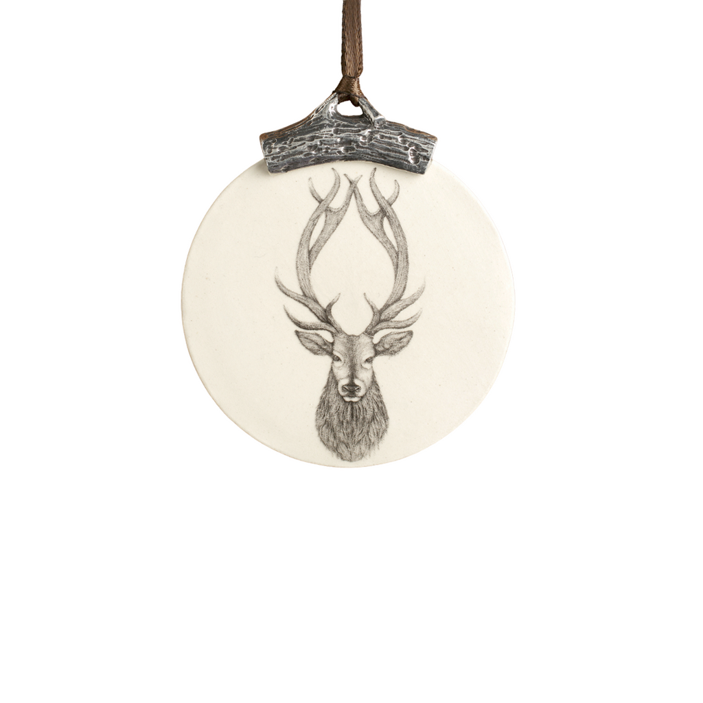Welcome to the charm and serenity that is nature into your home with a beautiful Laura Zindel piece! This ceramic ornament adorns the artist's original illustration of a red stag and is topped with a pewter branch. Measures 2.5 inches in diameter. Handcrafted in US.