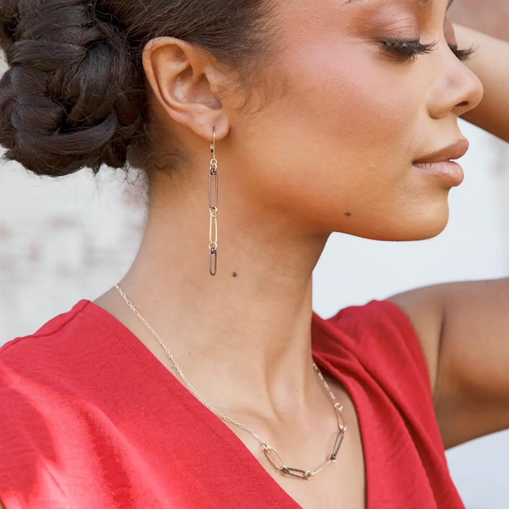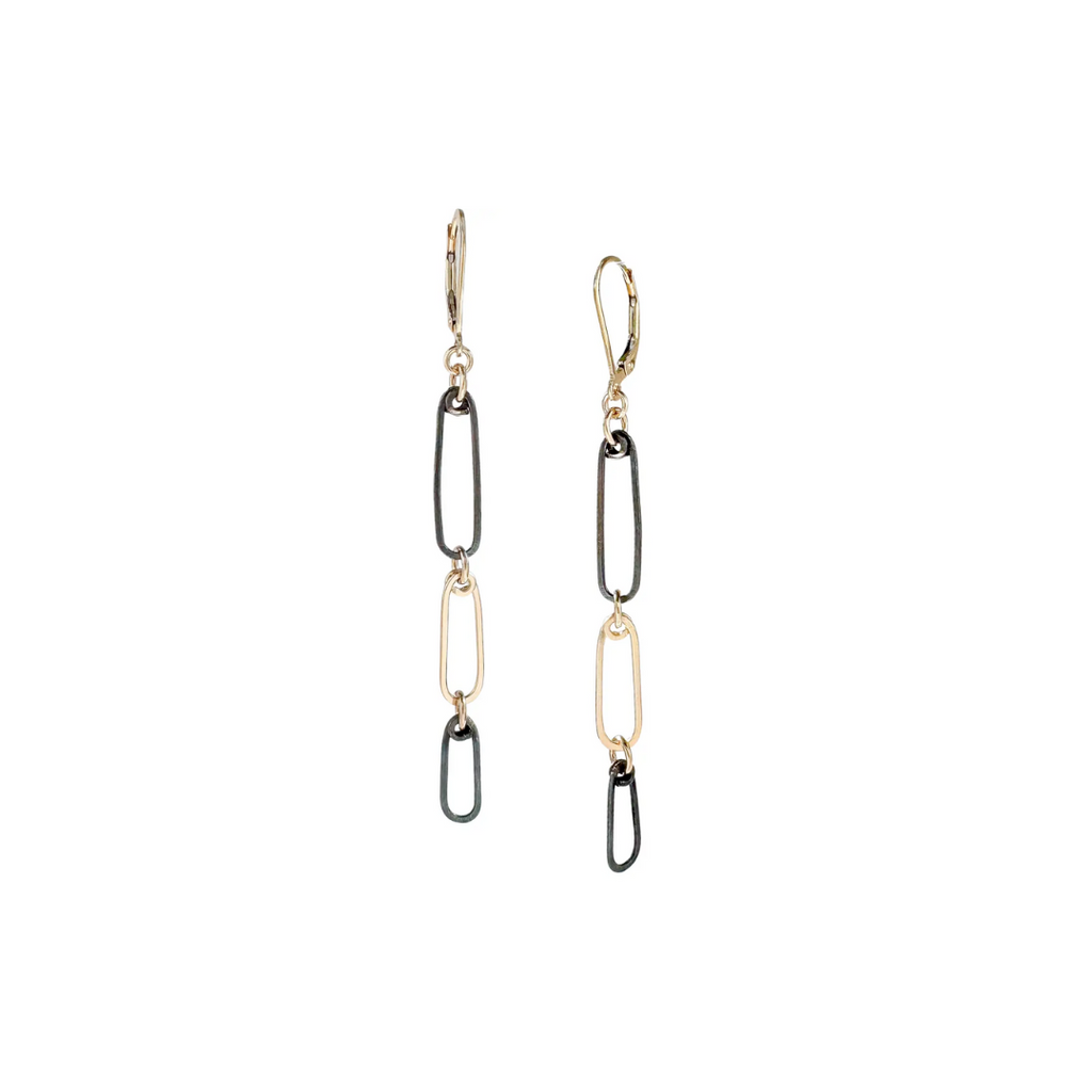 Minimalism at its best, these Reef Paperclip earrings by Freshie & Zero are light, sexy, and great for everyday wear! Elongated wire paperclip links in oxidized sterling silver and gold fill are suspended on gold filled leverback earwires. The earrings measure 2.88" long and 0.2" wide. Handmade in US.