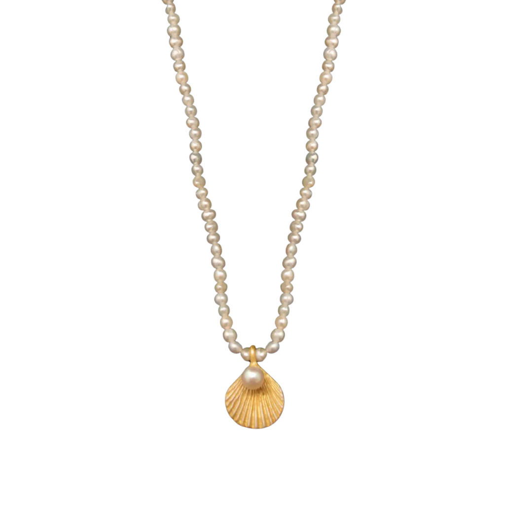 Behold nature and all its charm with this sea scallop necklace by Silver Seasons. Made by creating molds directly from botanical elements, artist Michael Michaud effortlessly captures both the beauty and details of the actual flora. Made with white freshwater pearls and cast bronze with a gold plating. The pendant measures approximately 0.5" at the widest and 0.75" long. The necklace is adjustable from 15-17". Handmade in US.