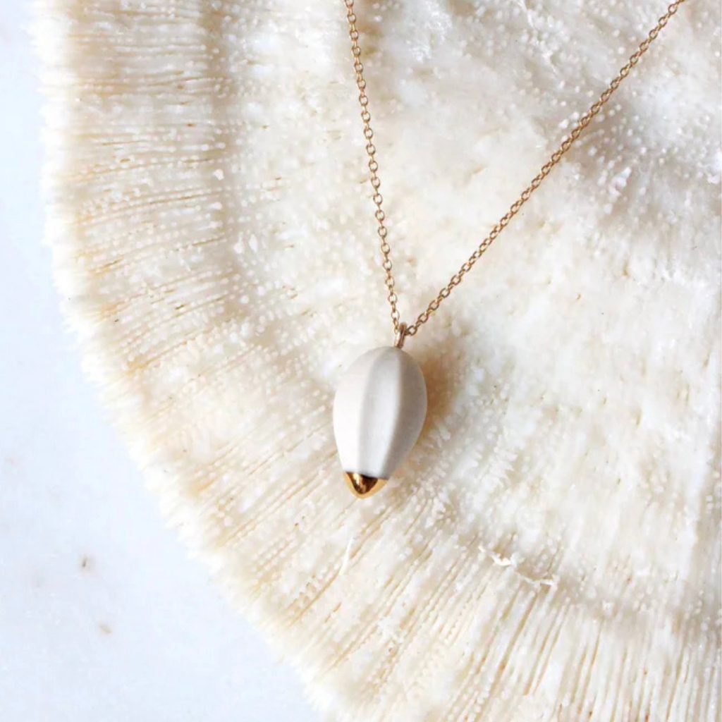 Inspired by nature, the ocean, organic shapes, and textures, Mier Luo jewelry will bring a classic and unique twist to your personal collection! Each piece is made from porcelain and 22k gold glaze. The Seed No. 1 Necklace has an 18" gold filled chain and the pendant measures approximatly 0.69" long by 0.38" wide. Please note there might be slight variations in the color and size since each piece is handmade, sculpted, and assembled by Mier herself in her studio in New York City.
