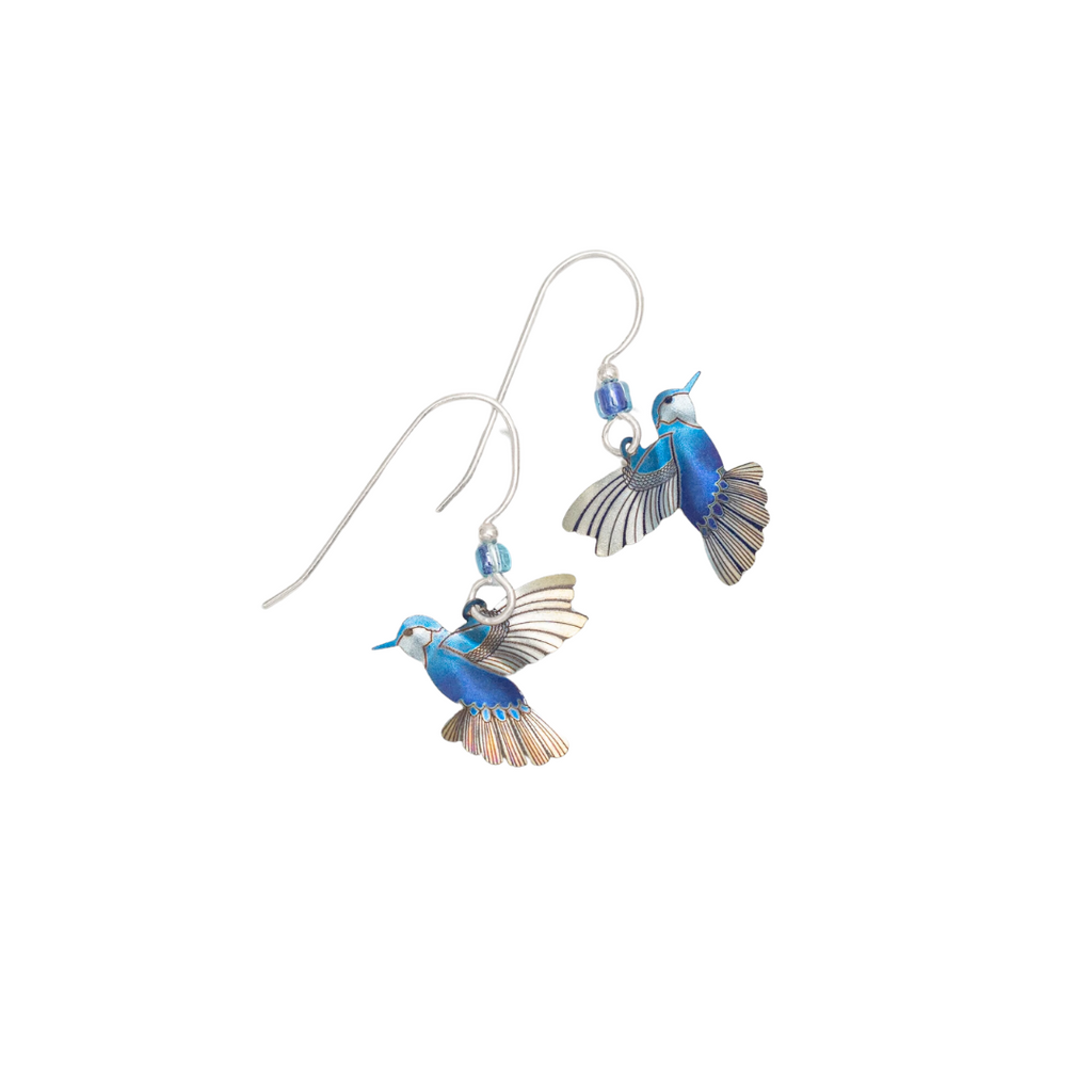 Add a pop of color with these natured-inspired earrings by Holly Yashi. Made of niobium, these earrings feature a blue hummingbird with a blue glass bead at the top. Measure approximately 1.25" L and 0.75" W. Sterling silver earwires. Handcrafted in US.