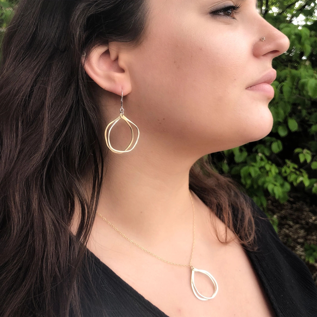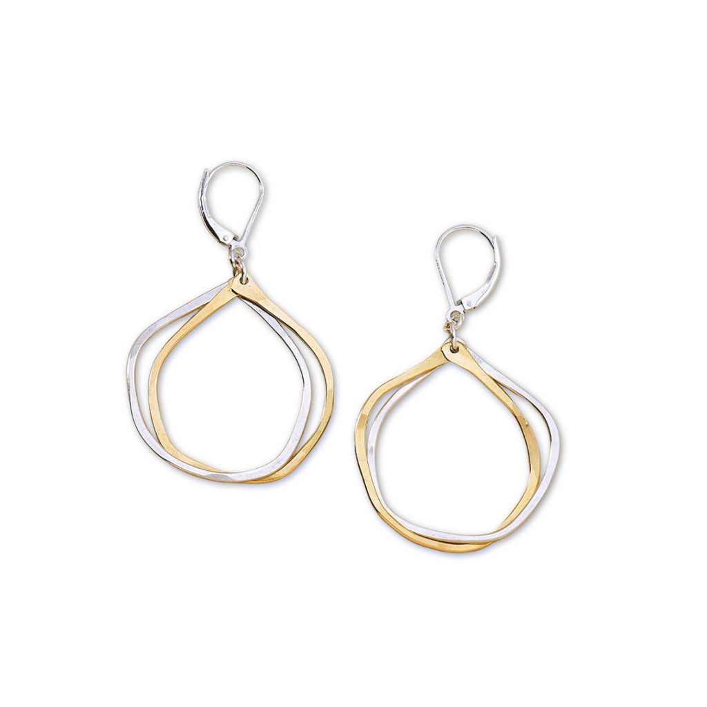 Minimalism at its best, these splash earrings by Freshie & Zero are light, sexy, and great for everyday wear! Two not-so-perfect hammered circles of shiny silver and gold fill are suspended on sterling silver lever back ear wires. The circles measures approximately 1.12" in diameter and measure 2" from the top of the ear wire to the bottom of the circles. Handmade in US.