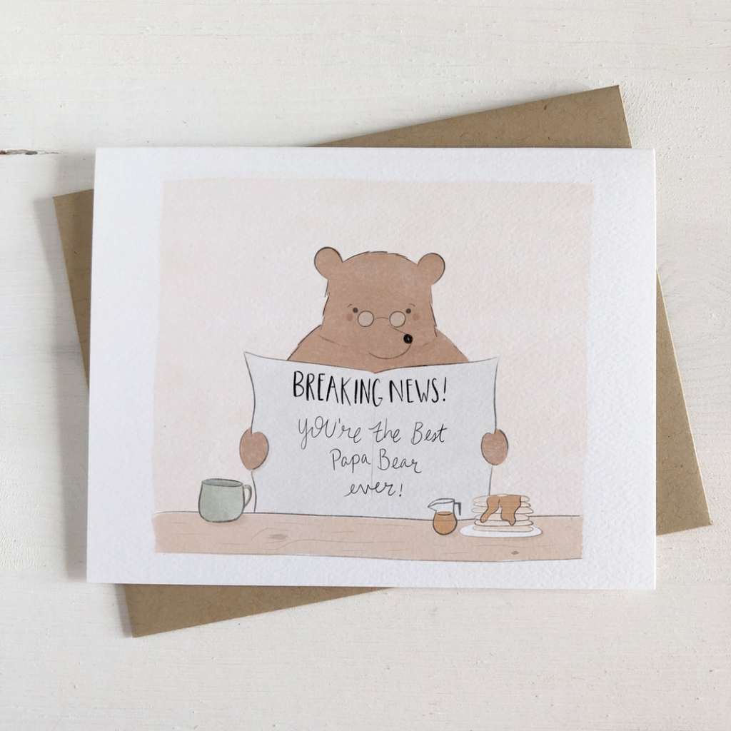 Welcome to the world of Fox & Bear Paper Co! Celebrate Father's Day with this sweet card of papa bear sitting down to breakfast with the morning paper that reads "Breaking news! You're the best papa bear ever!". The card measures 4.25" x 5.5". The inside is blank. The card includes recycled kraft envelope. Packaged in a cellophane sleeve.
