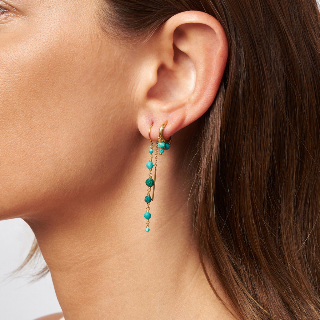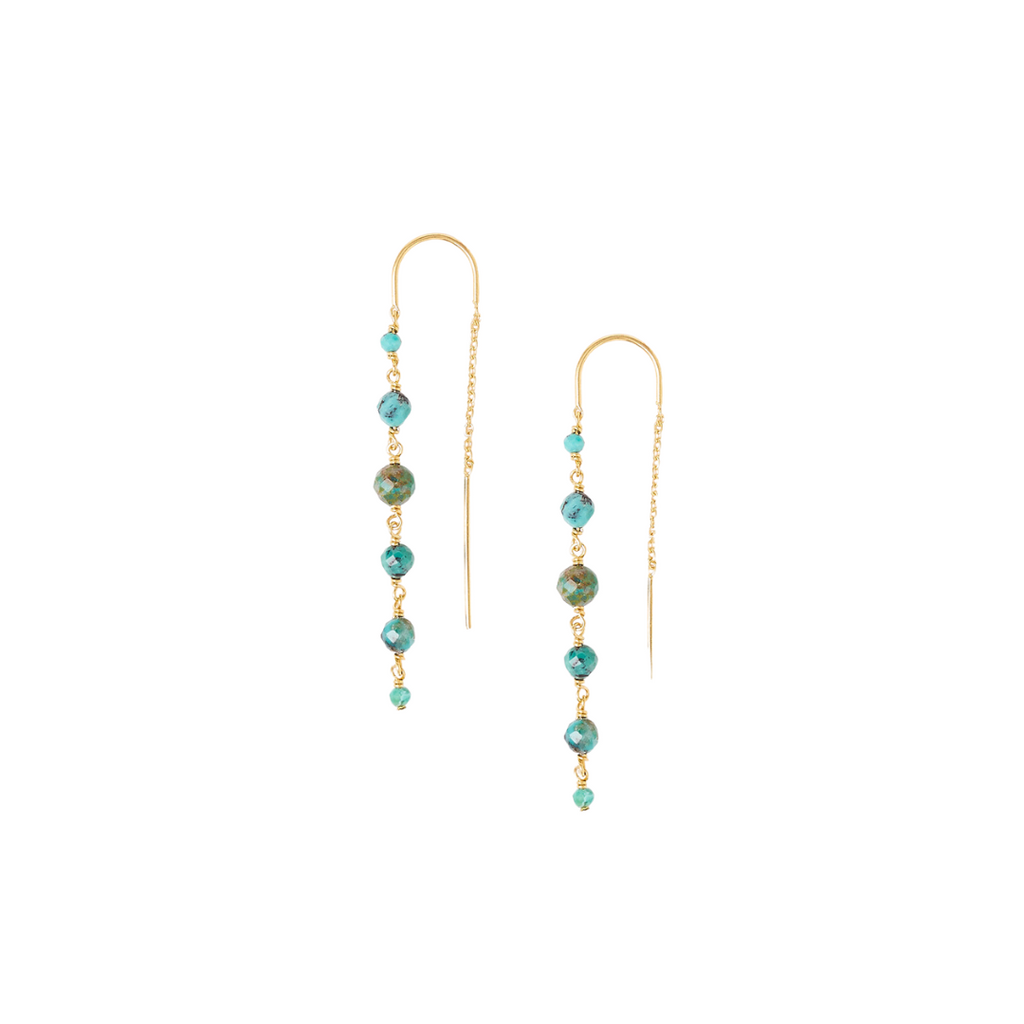 Elegant and festive, these Chan Luu threader earrings feature a cascade of turquoise beads. Made of 18k yellow gold plate over sterling silver, the earrings measure 1.88" long. Handmade in Vietnam.