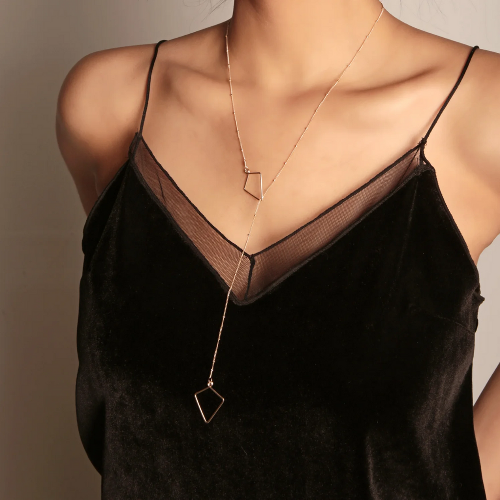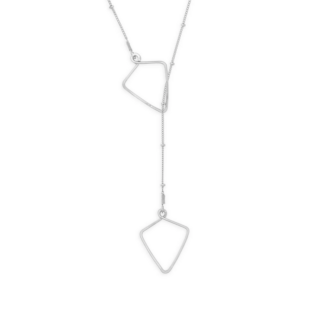 Diamond-shaped pendants drape to form the Vivid lariat necklace by Freshie & Zero. The angled and edgy shape with the dotted chain will take you from day to night with style! Made with hand formed sterling silver wire on a 24" dotted silver chain. Handmade in the US.