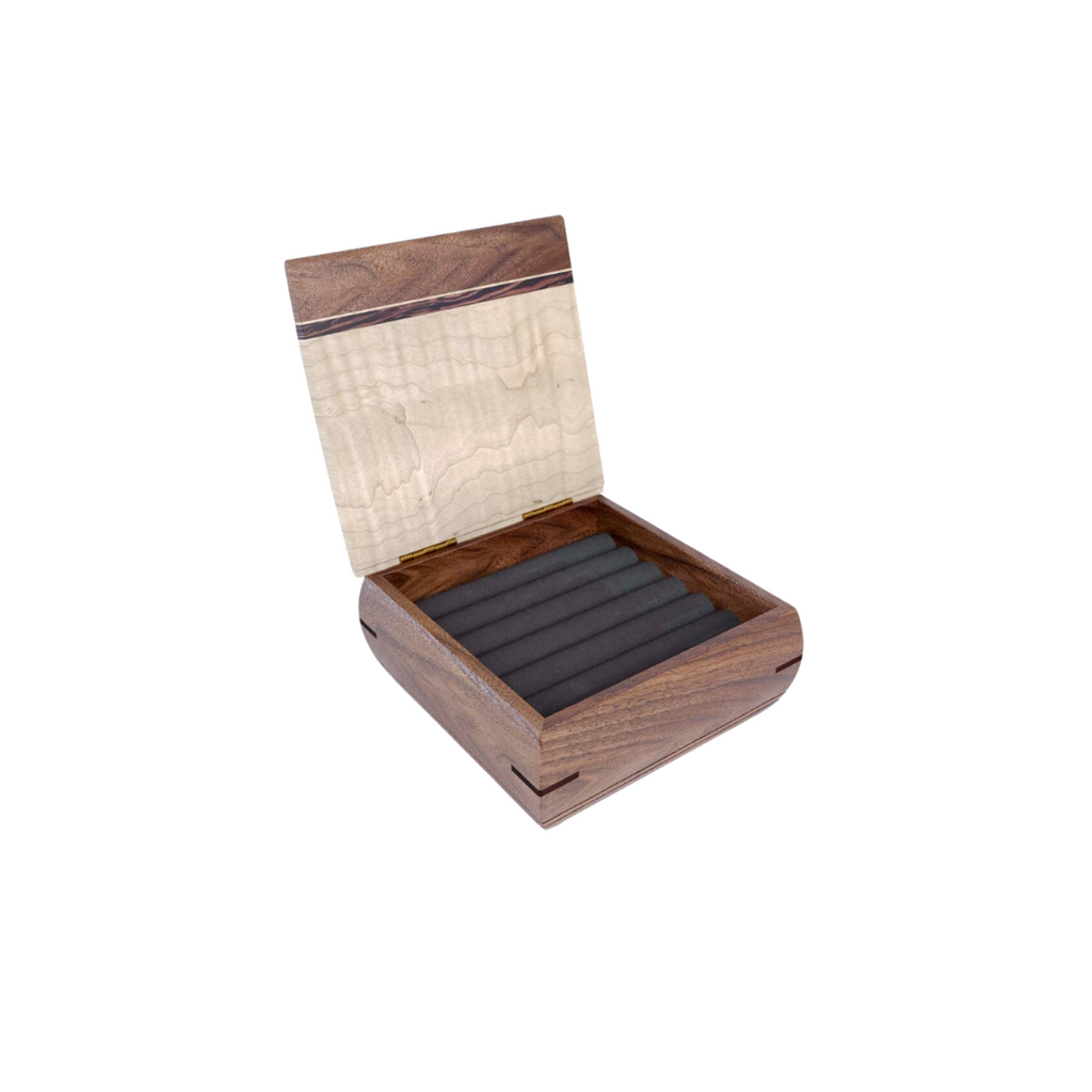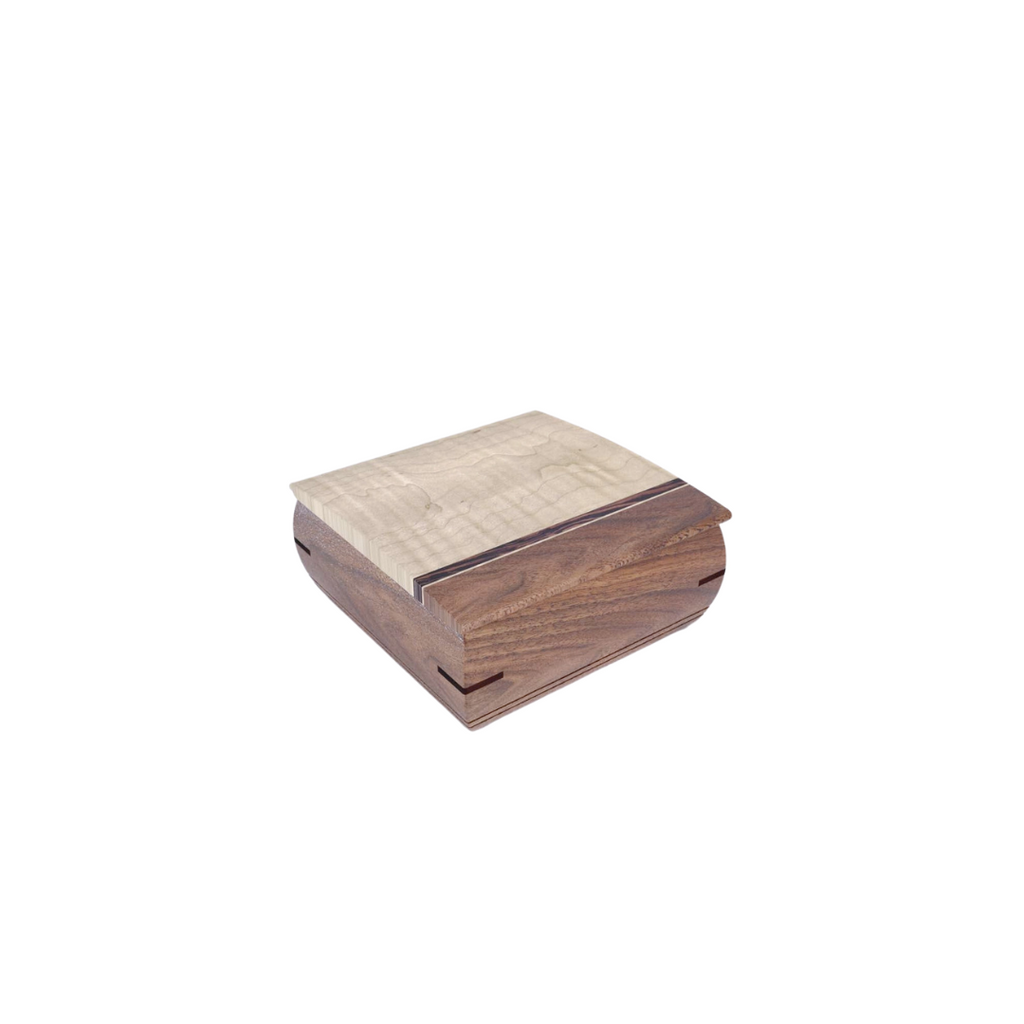 A stunning design paired with precise craftsmanship, this wooden box by Mikutowski gives you an elegant yet functional way to store and organize your jewelry. Equipped with plush ring inserts, this box has a place for multiple rings or studs or cufflinks. Made of shedua, curly maple, and wenge wood. Measures 4.25” x 4.25” x 2”. Handcrafted in the US.