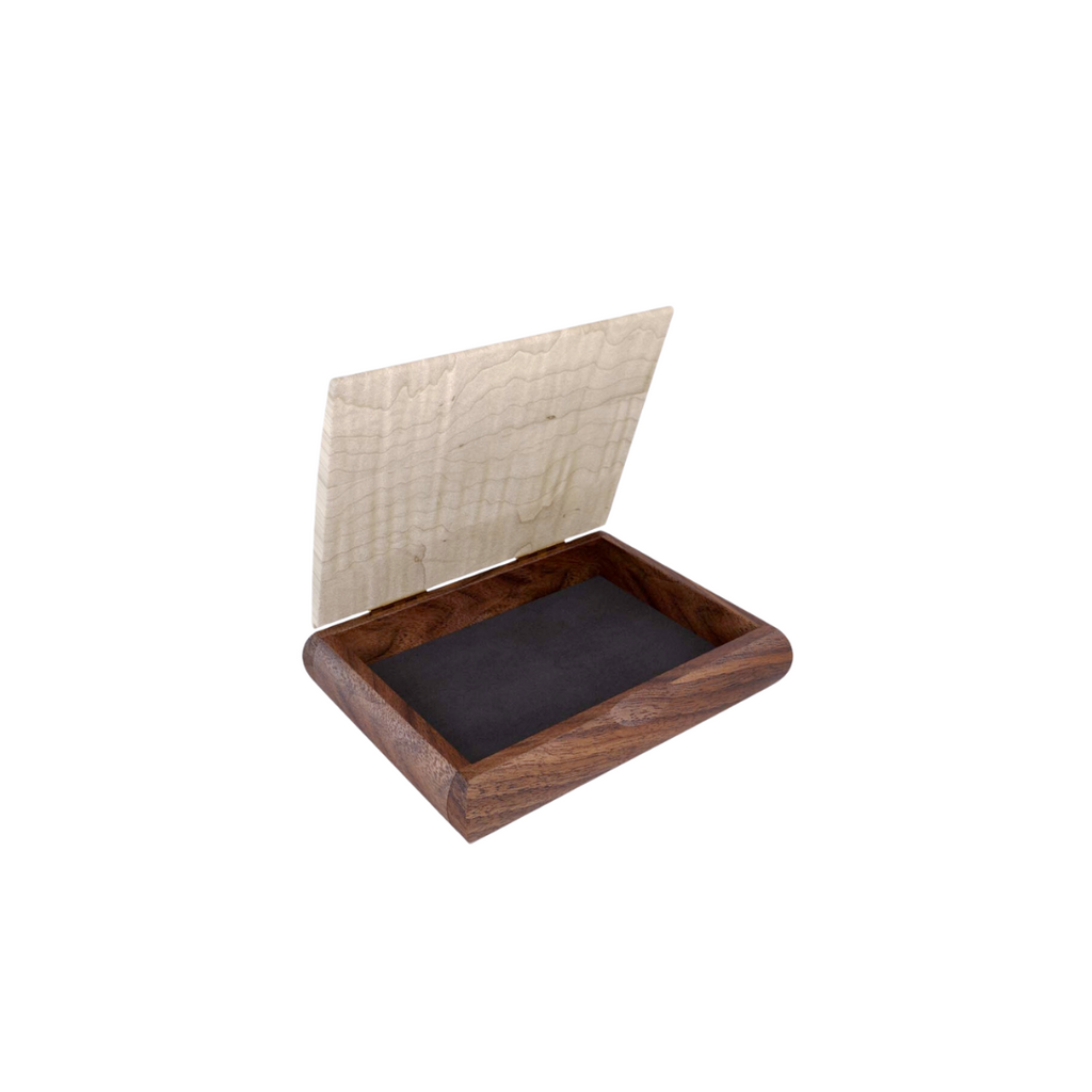 A stunning design paired with precise craftsmanship, this wooden box by Mikutowski gives you an elegant yet functional way to store and organize your jewelry or treasures. Made of walnut and curly maple wood. Measures 6” x 3.25” x 1.5”. Handcrafted in the US.
