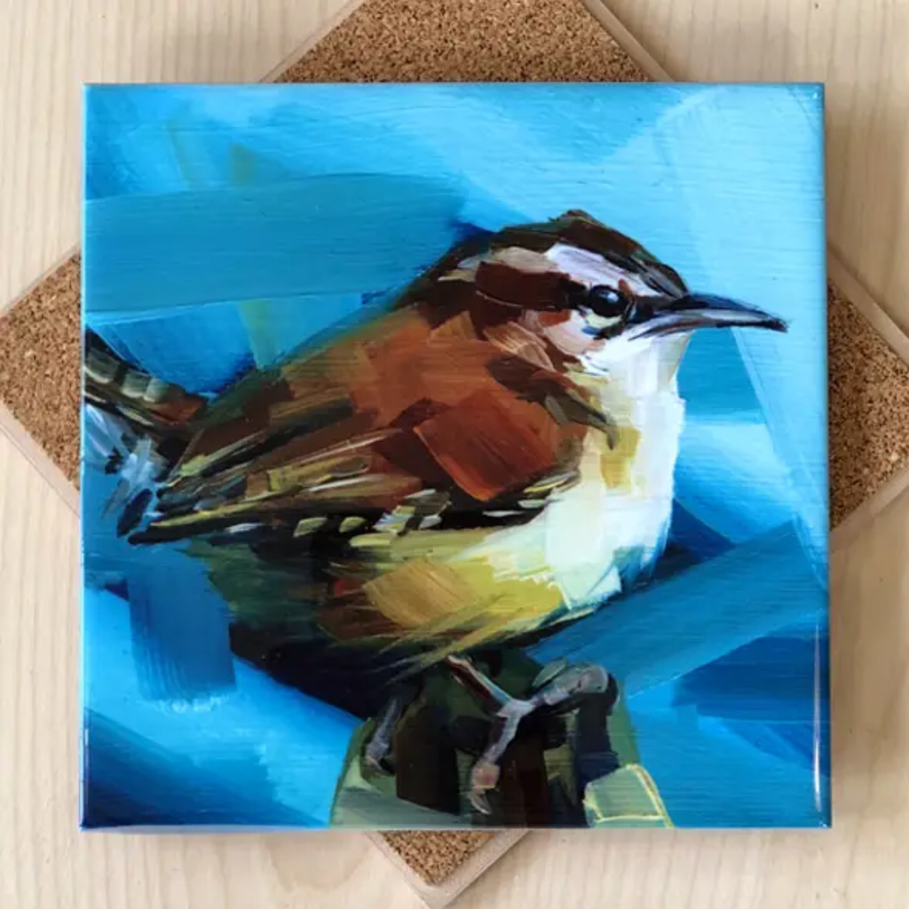 Celebrate your love of birds and wrens with this trivet by Art by Alyssa. Printed from the artist's original oil paintings, this trivet is both functional and beautiful to display in your kitchen. With a cork backing, the trivets are food safe, but please do not submerge them in water, put in the microwave or dish washer. The trivet measures 6 x 6 inches and can handle both hot and cold temperatures.